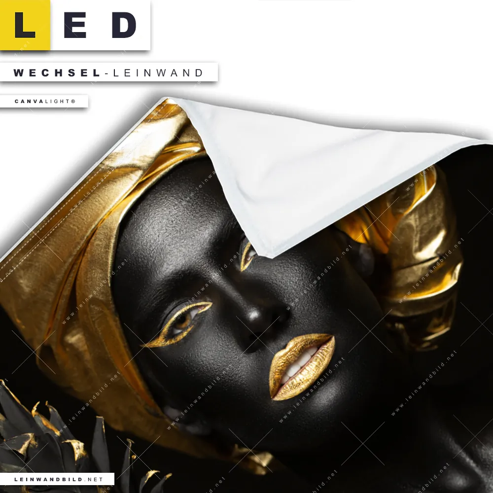 Dann sollte die Wechsel-Leinwand Canvalight® TEX | Goldenes Ananasmädchen No.1 | Quadrat den Weg zu Dir finden. Die Austausch-Leinwand Frau mit goldener Kopfbedeckung - passend für unsere stufenlos dimmbaren, steckerfertigen Leinwandbilder im Leuchtrahmen mit Fernbedienung und optionaler Farbtemperatursteuerung - fügt sich als Eye-Catcher harmonisch in jedes Bar - Gastronomie, Friseur - Beauty, Wohnzimmer - Schlafzimmer Raumkonzept ein.