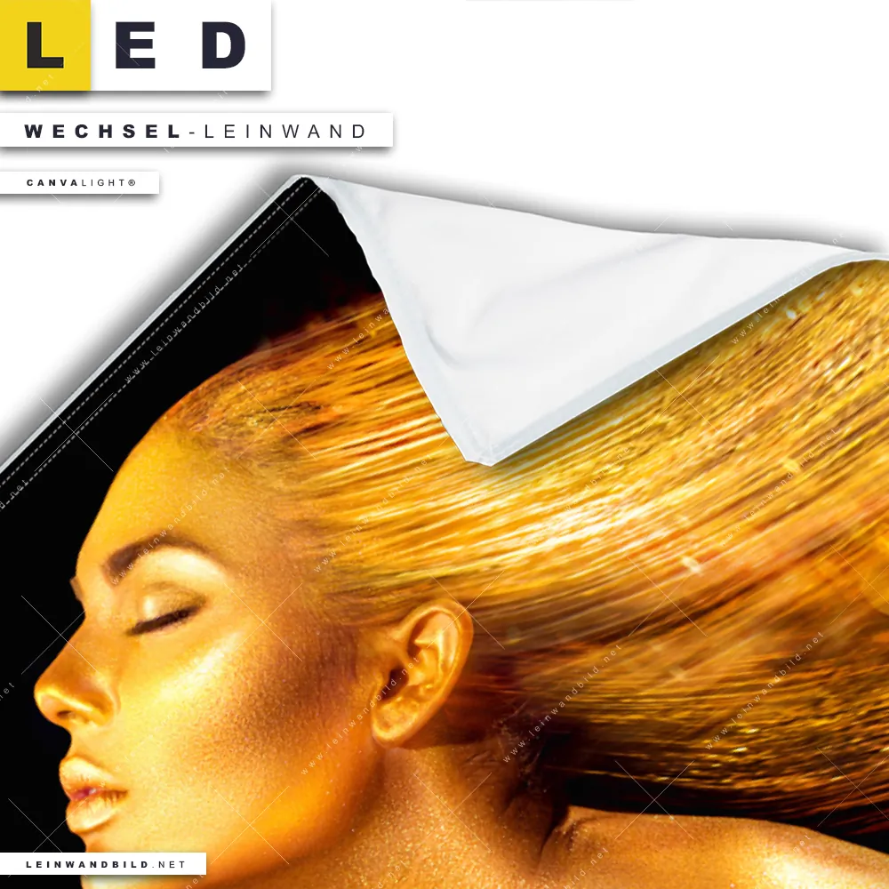 Dann sollte die Wechsel-Leinwand Canvalight® TEX | Goldenes Haar | Quadrat den Weg zu Dir finden. Die Austausch-Leinwand Goldfrau - passend für unsere stufenlos dimmbaren, steckerfertigen Leinwandbilder im Leuchtrahmen mit Fernbedienung und optionaler Farbtemperatursteuerung - fügt sich als Eye-Catcher harmonisch in jedes Friseur - Beauty, Flur - Eingangsbereich, Wohnzimmer - Schlafzimmer Raumkonzept ein.