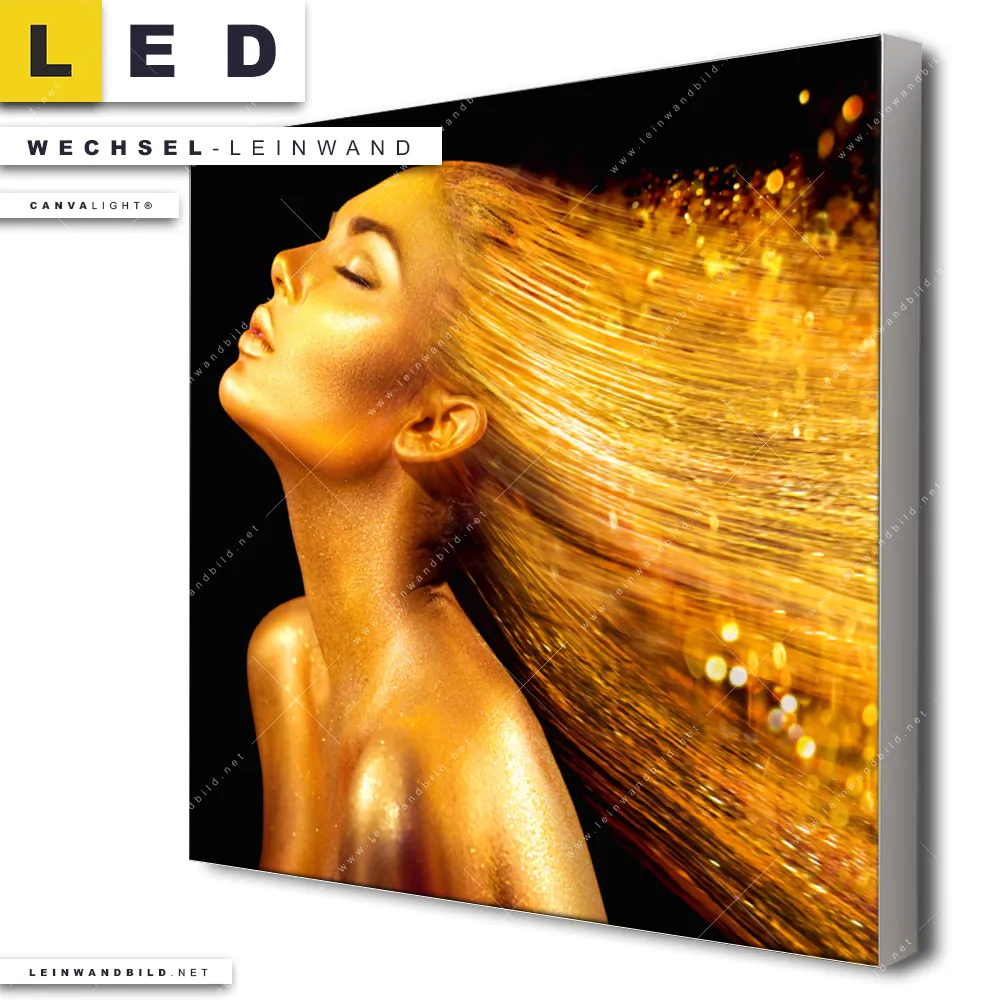 Du bist auf der Suche nach einer Porträts - Menschen Wechsel-Leinwand für Dein LED-Leinwandbild im Quadratischen Format? Begriffe wie Frau, Porträt, Erotik, modern, Gold, Farbe, Beauty, Haar, Gesicht, Körper haben Dich auf der Suche nach Deiner Ersatz-Leinwand für dein LED Wandbild mit wechselbarer Leinwand inspiriert? Farben wie Gold, Schwarz dürfen auf Deinem neuen Wechselmotiv für Dein XXL Leinwand-LED-Bild nicht fehlen und Leinwände im Modern Art Stil für Leuchtbilder passen perfekt zu Deinem Einrichtungsstil?