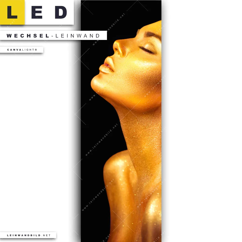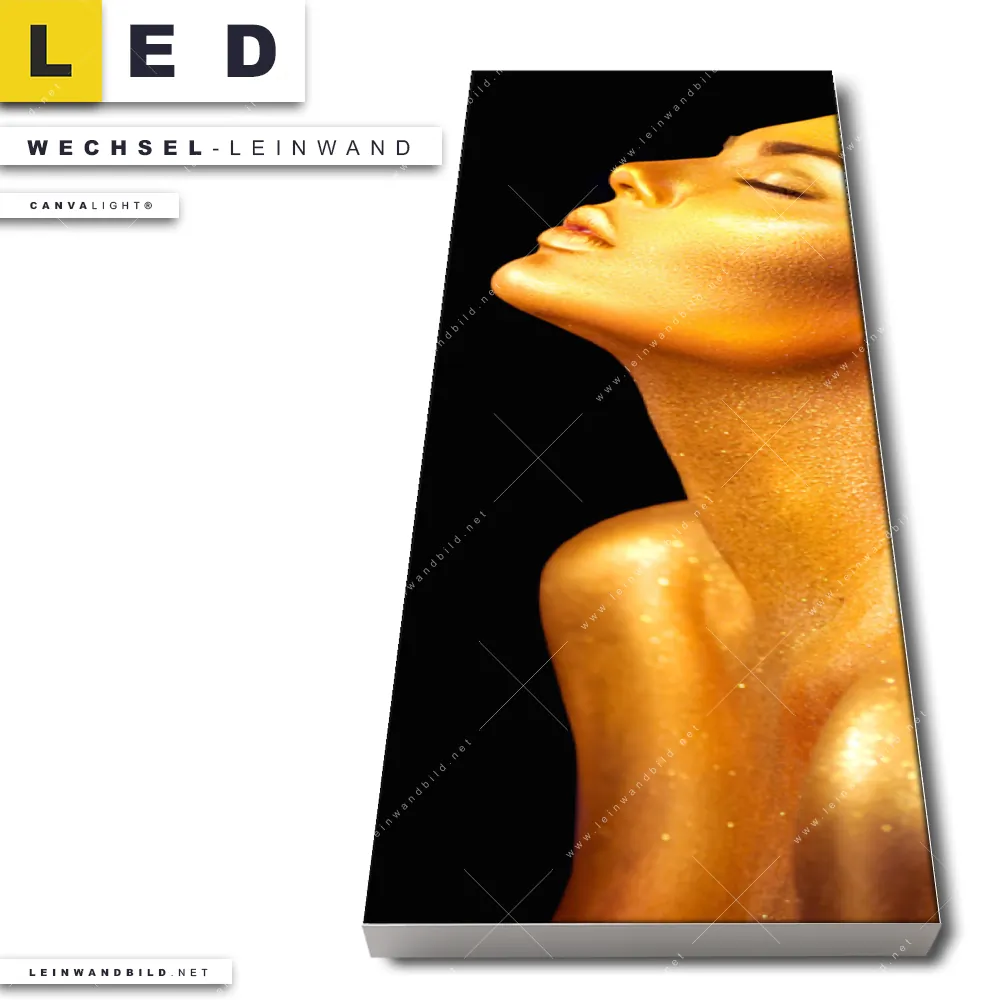 Du bist auf der Suche nach einer Porträts - Menschen Wechsel-Leinwand für Dein LED-Leinwandbild im Schmalen Format? Begriffe wie Frau, Porträt, Erotik, modern, Gold, Farbe, Beauty, Haar, Gesicht, Körper haben Dich auf der Suche nach Deiner Ersatz-Leinwand für dein LED Wandbild im Panorama-Hochformat mit wechselbarer Leinwand inspiriert? Farben wie Gold, Schwarz dürfen auf Deinem neuen Wechselmotiv für Dein XXL Leinwand-LED-Bild nicht fehlen und Leinwände im Modern Art Stil für Leuchtbilder passen perfekt zu Deinem Einrichtungsstil?