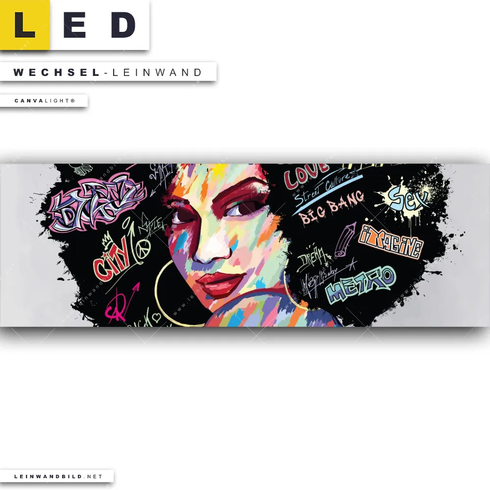 Dann sollte die Wechsel-Leinwand Canvalight® TEX | Graffiti Afro No.1 | Panorama den Weg zu Dir finden. Die Austausch-Leinwand bunte Graffitis im Frauenhaar - passend für unsere stufenlos dimmbaren, steckerfertigen Leinwandbilder im LED Leuchtrahmen mit Fernbedienung und optionaler Farbtemperatursteuerung - fügt sich als Eye-Catcher harmonisch in jedes Wohnzimmer - Schlafzimmer, Bar - Gastronomie, Friseur - Beauty Raumkonzept ein.