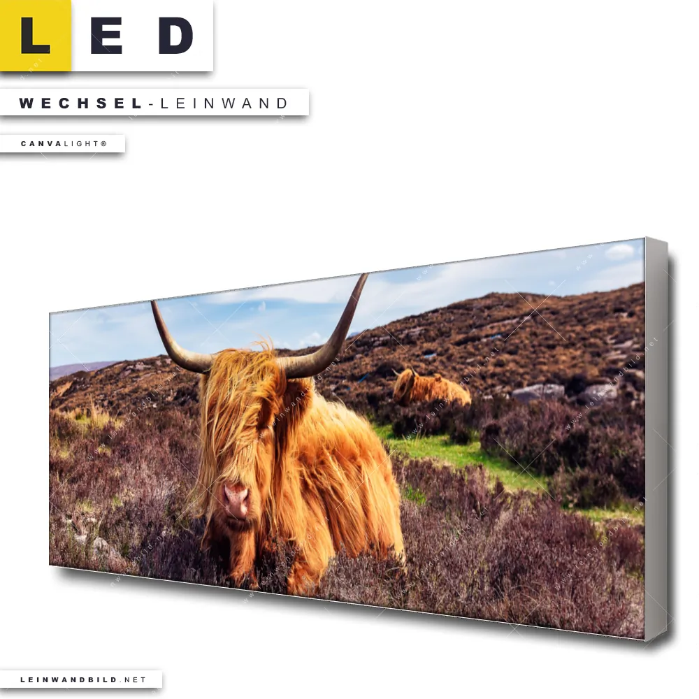 Du bist auf der Suche nach einer Tierwelt Wechsel-Leinwand für Dein LED-Leinwandbild im Panorama-Format? Begriffe wie Tier, Stier, Hochlandkuh, Highlander, Büffel, Rind, Bulle, Hochlandrind, Wiese, Weide, Hörner, Gras haben Dich auf der Suche nach Deiner Ersatz-Leinwand für dein extra breites LED Wandbild mit wechselbarer Leinwand inspiriert? Farben wie Braun, Beige, Hellblau dürfen auf Deinem neuen Wechselmotiv für Dein XXL Leinwand-LED-Bild nicht fehlen und Leinwände im Modern Art, Natürlich - Realistisch Stil für Leuchtbilder passen perfekt zu Deinem Einrichtungsstil?
