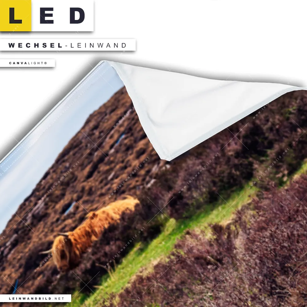 Du konfigurierst Deine individuelle LED Wechsel-Leinwand Canvalight® TEX | Grasendes Hochlandrind | Panorama und wir produzieren sie NEU für Dich. Unsere Tierwelt Austausch-Fotoleinwände für Canvalight® LED Bilder sind KEINE Lagerware. Du bist Dir unsicher, welches Motiv oder Format das richtige für dein individuelles LED Wechselmotiv auf Leinwand ist, dann helfen wir dir gerne weiter und beraten dich!