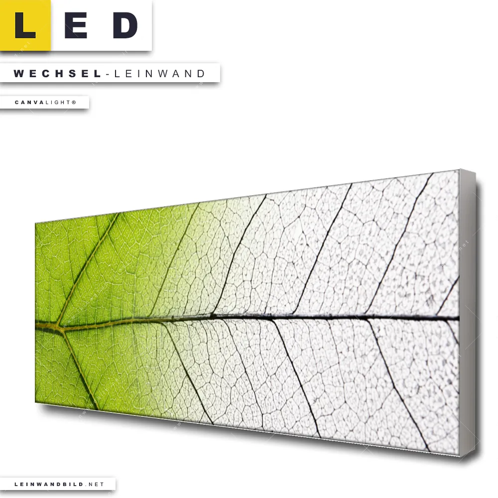 Dann sollte die Wechsel-Leinwand Canvalight® TEX | Grünes Blatt | Panorama den Weg zu Dir finden. Die Austausch-Leinwand Blatt mit Farbverlauf - passend für unsere stufenlos dimmbaren, steckerfertigen Leinwandbilder im LED Leuchtrahmen mit Fernbedienung und optionaler Farbtemperatursteuerung - fügt sich als Eye-Catcher harmonisch in jedes Arzt - Praxis, Büro - Kanzlei, Wohnzimmer - Schlafzimmer Raumkonzept ein.
