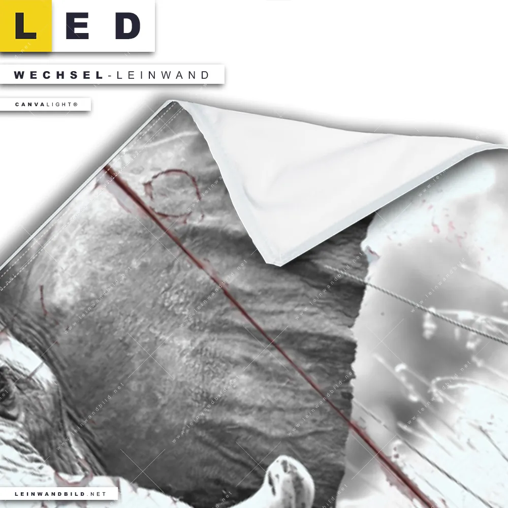 Bitte beachte, dass die Farben, der auf dem Monitor abgebildeten Elefant in der Collage Darstellung, möglicherweise von den Originalfarben deiner Canvalight® TEX Wechsel-Leinwand abweichen können.