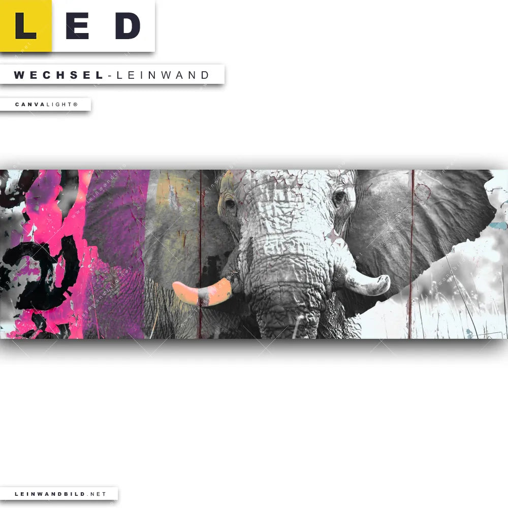 Du bist auf der Suche nach einer Tierwelt Wechsel-Leinwand für Dein LED-Leinwandbild im Panorama-Format? Begriffe wie Tier, Grunge, Elefant, Afrika, Safari, industriell haben Dich auf der Suche nach Deiner Ersatz-Leinwand für dein extra breites LED Wandbild mit wechselbarer Leinwand inspiriert? Farben wie Pink, Grau , Lila, Weiss, Schwarz dürfen auf Deinem neuen Wechselmotiv für Dein XXL Leinwand-LED-Bild nicht fehlen und Leinwände im Modern Art, Abstrakt, Pop Art Stil für Leuchtbilder passen perfekt zu Deinem Einrichtungsstil?