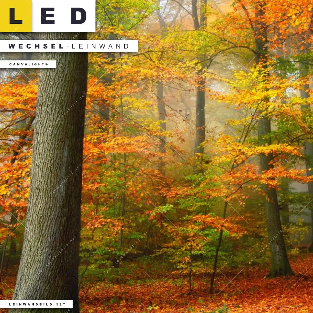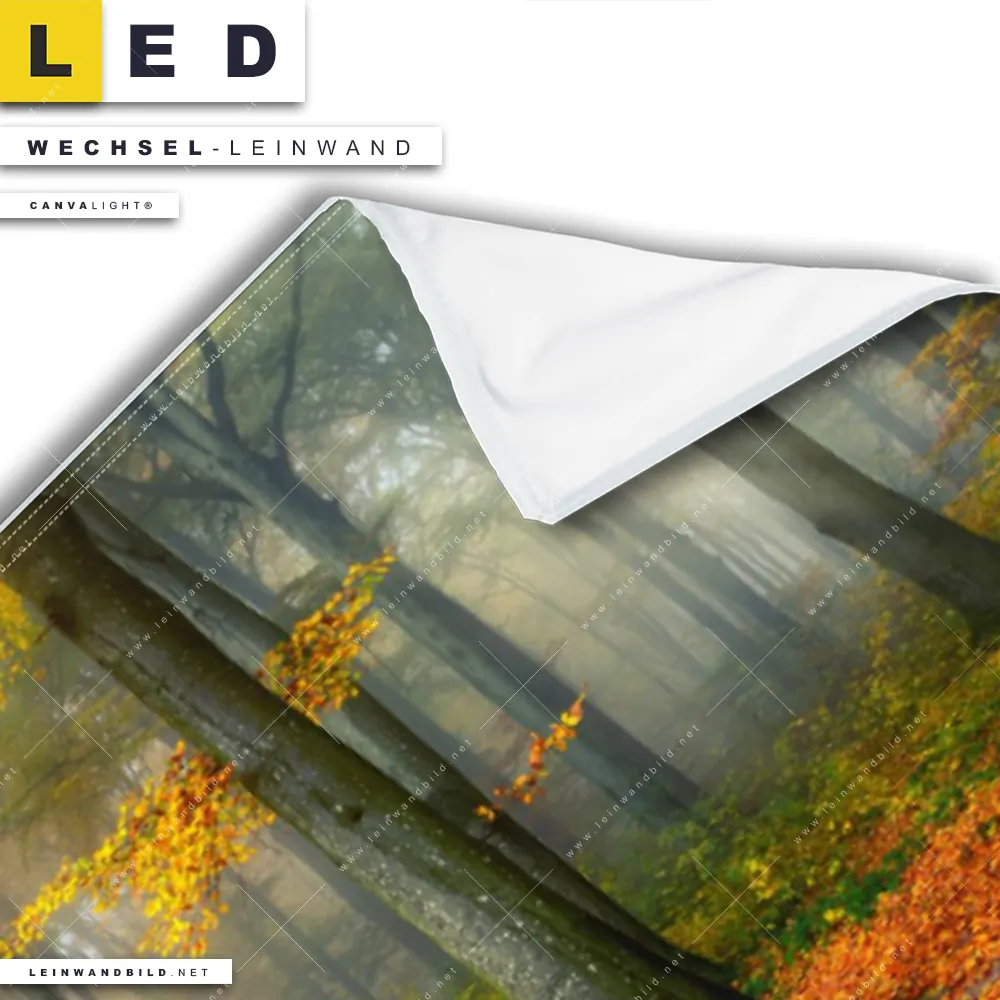 LED Wechsel-Leinwand Canvalight® TEX | Herbstfarben im nebligen Wald | Panorama