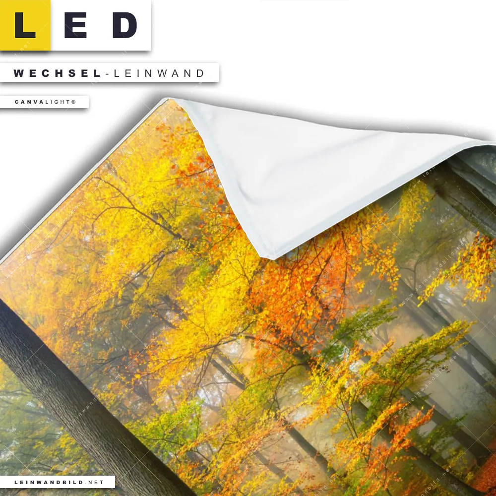 Du konfigurierst Deine individuelle LED Wechsel-Leinwand Canvalight® TEX | Herbstfarben im nebligen Wald | Quadrat und wir produzieren sie NEU für Dich. Unsere Landschaften, Wald - Bäume Austausch-Fotoleinwände für Canvalight® LED Bilder sind KEINE Lagerware. Du bist Dir unsicher, welches Motiv oder Format das richtige für dein individuelles LED Wechselmotiv auf Leinwand ist, dann helfen wir dir gerne weiter und beraten dich!