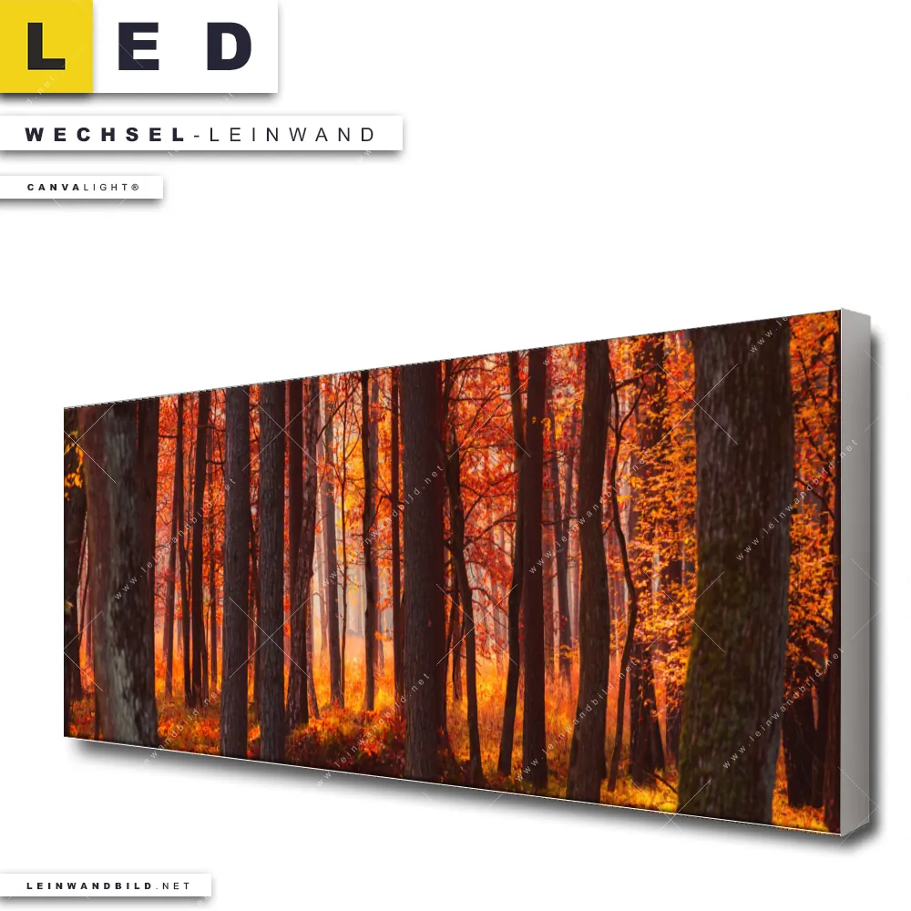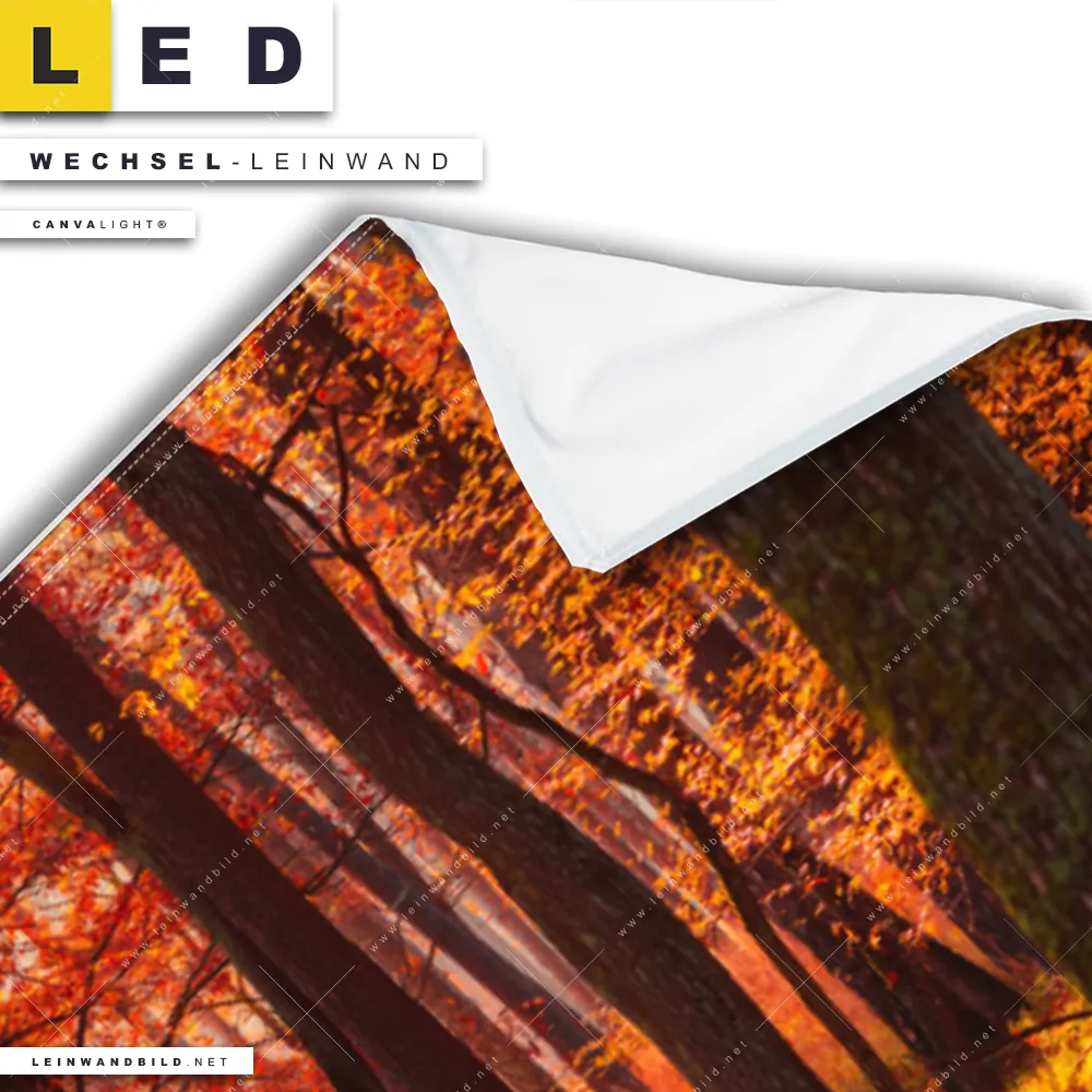 Du konfigurierst Deine individuelle LED Wechsel-Leinwand Canvalight® TEX | Herbstwald | Panorama und wir produzieren sie NEU für Dich. Unsere Landschaften, Wald - Bäume Austausch-Fotoleinwände für Canvalight® LED Bilder sind KEINE Lagerware. Du bist Dir unsicher, welches Motiv oder Format das richtige für dein individuelles LED Wechselmotiv auf Leinwand ist, dann helfen wir dir gerne weiter und beraten dich!