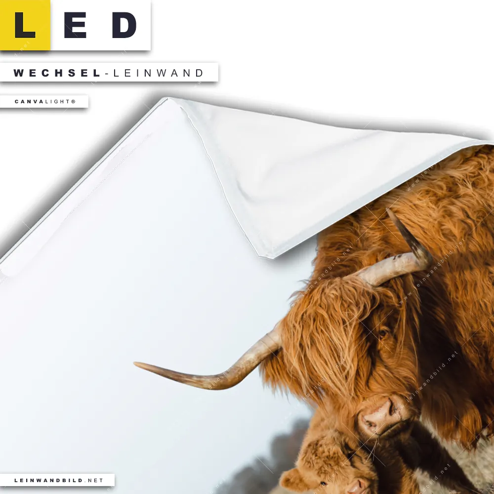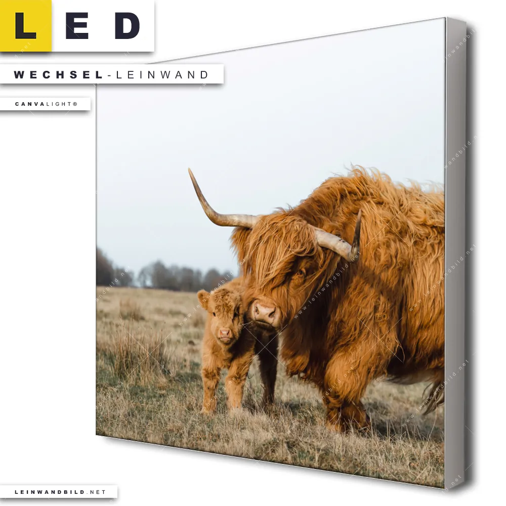 Du konfigurierst Deine individuelle LED Wechsel-Leinwand Canvalight® TEX | Highlander Familie | Quadrat und wir produzieren sie NEU für Dich. Unsere Tierwelt Austausch-Fotoleinwände für Canvalight® LED Bilder sind KEINE Lagerware. Du bist Dir unsicher, welches Motiv oder Format das richtige für dein individuelles LED Wechselmotiv auf Leinwand ist, dann helfen wir dir gerne weiter und beraten dich!