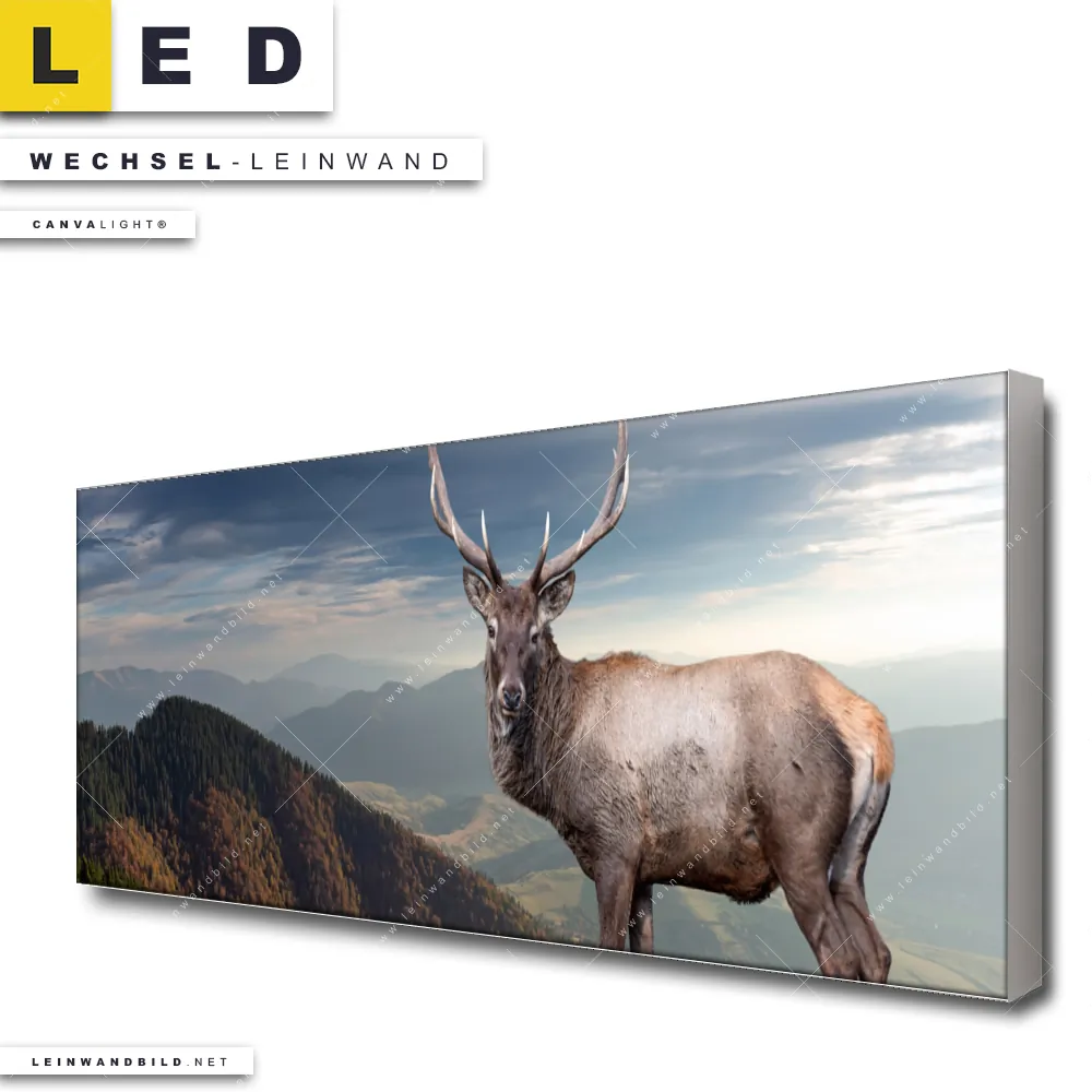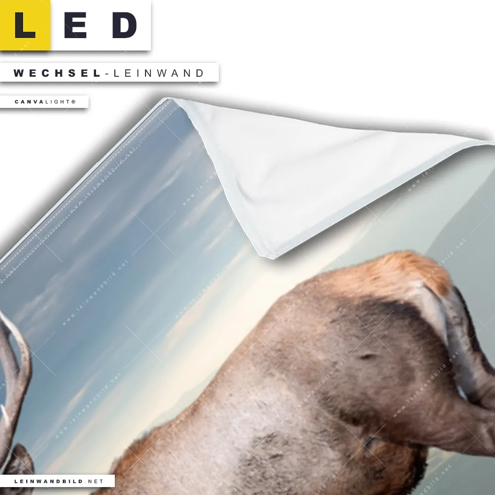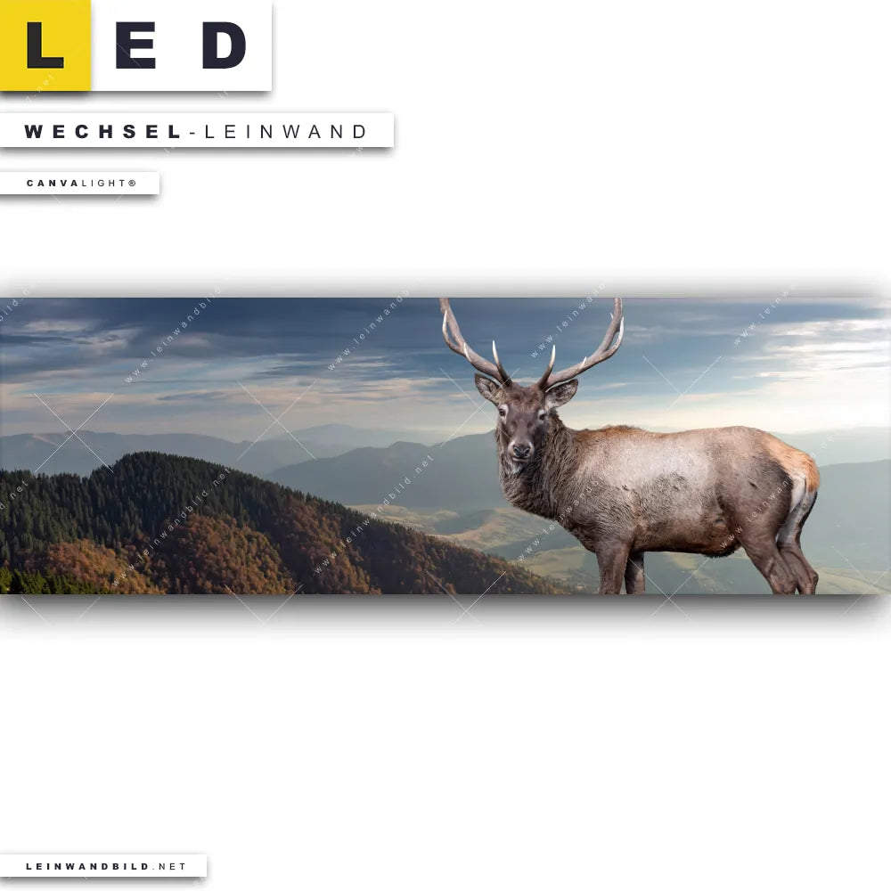 Du bist auf der Suche nach einer Landschaften, Tierwelt Wechsel-Leinwand für Dein LED-Leinwandbild im Panorama-Format? Begriffe wie Wald, Bäume, Natur, Hirsch, Deer, Wild, Rotwild, Berge, Feld haben Dich auf der Suche nach Deiner Ersatz-Leinwand für dein extra breites LED Wandbild mit wechselbarer Leinwand inspiriert? Farben wie Beige, Braun, Blau dürfen auf Deinem neuen Wechselmotiv für Dein XXL Leinwand-LED-Bild nicht fehlen und Leinwände im Natürlich - Realistisch Stil für Leuchtbilder passen perfekt zu Deinem Einrichtungsstil?