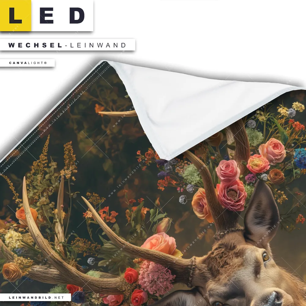 Bitte beachte, dass die Farben, der auf dem Monitor abgebildeten Hirsch mit Blumenkranz Darstellung, möglicherweise von den Originalfarben deiner Canvalight® TEX Wechsel-Leinwand abweichen können.