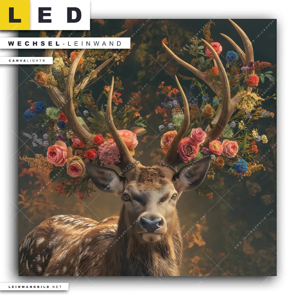 Du bist auf der Suche nach einer Tierwelt, Blumen - Botanik Wechsel-Leinwand für Dein LED-Leinwandbild im Quadratischen Format? Begriffe wie Rotwild, Wald, Hirsch, Blüten, Geweih, Blumen, Rothirsch haben Dich auf der Suche nach Deiner Ersatz-Leinwand für dein LED Wandbild mit wechselbarer Leinwand inspiriert? Farben wie Beige, Braun, Rosa, Grün dürfen auf Deinem neuen Wechselmotiv für Dein XXL Leinwand-LED-Bild nicht fehlen und Leinwände im Floral, Retro - Vintage, Surreal - Fantasy Stil für Leuchtbilder passen perfekt zu Deinem Einrichtungsstil?