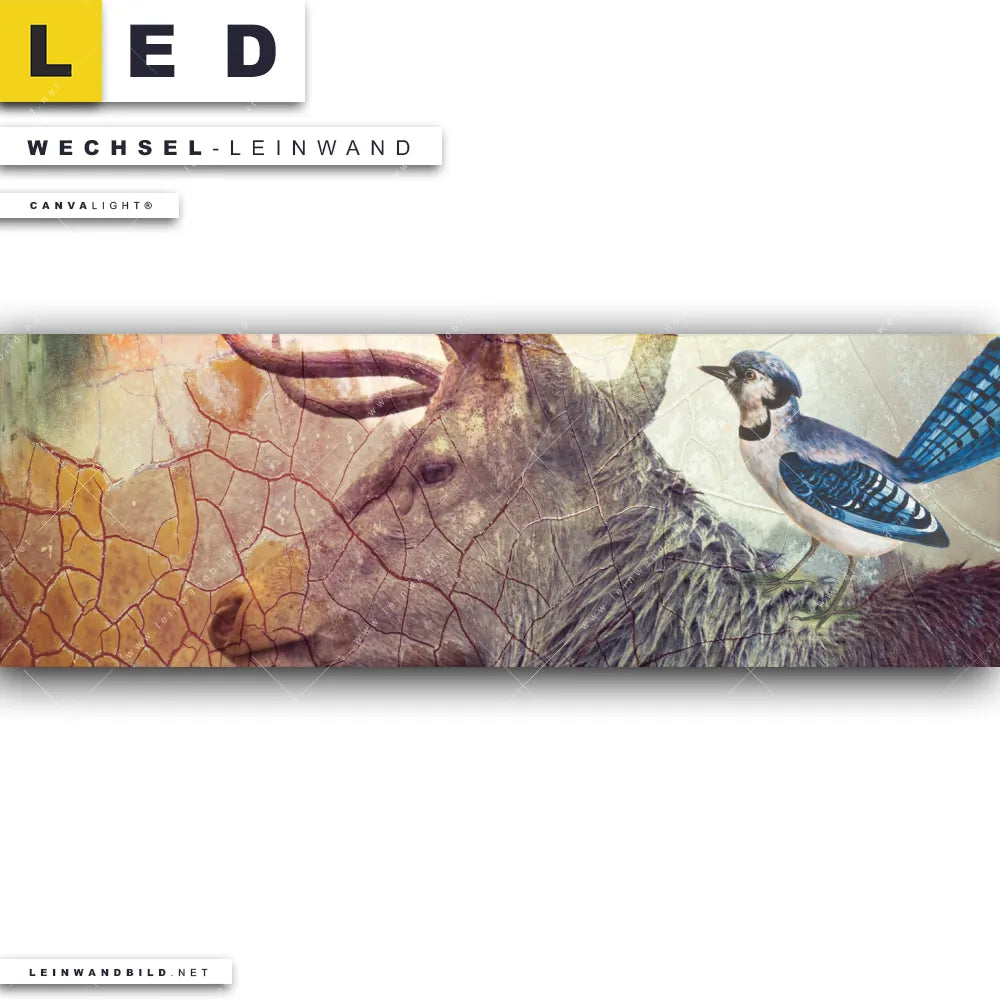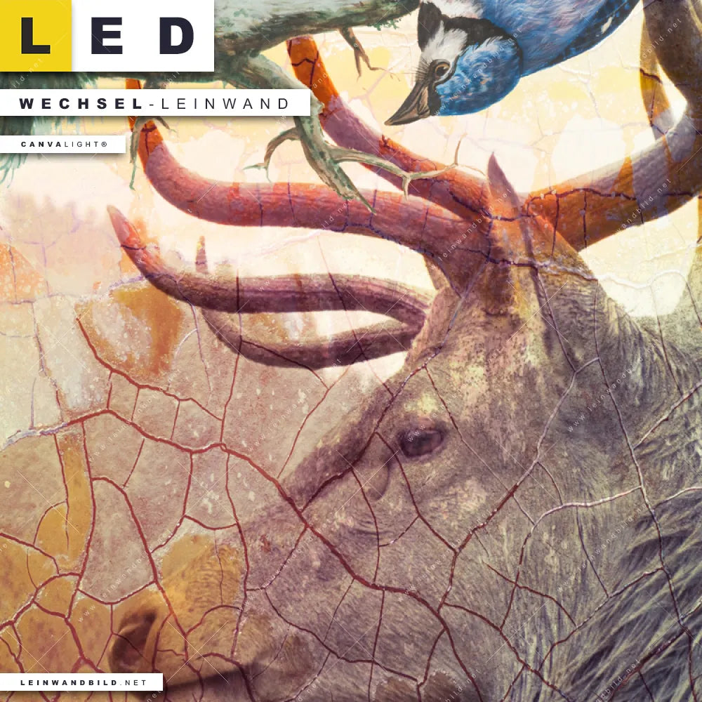 Du bist auf der Suche nach einer Tierwelt Wechsel-Leinwand für Dein LED-Leinwandbild im Panorama-Format? Begriffe wie Hirsch, Deer, Wald, Natur, skandinavisch, Bäume, Vögel haben Dich auf der Suche nach Deiner Ersatz-Leinwand für dein extra breites LED Wandbild mit wechselbarer Leinwand inspiriert? Farben wie Beige, Braun, Blau dürfen auf Deinem neuen Wechselmotiv für Dein XXL Leinwand-LED-Bild nicht fehlen und Leinwände im Abstrakt, Modern Art, Grunge, Mixed Media Stil für Leuchtbilder passen perfekt zu Deinem Einrichtungsstil?
