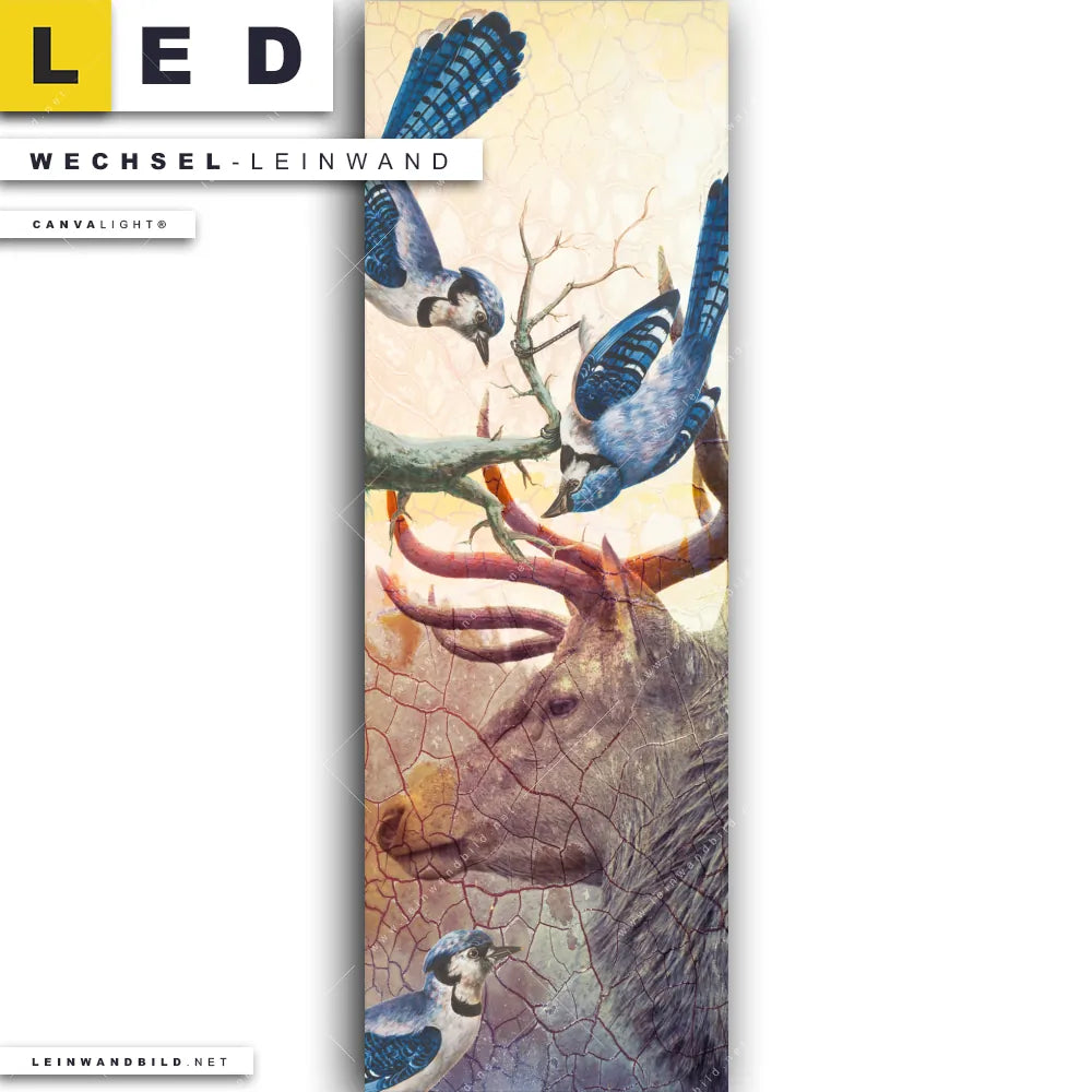Dann sollte die Wechsel-Leinwand Canvalight® TEX | Hirsch & Vögel | Schmal den Weg zu Dir finden. Die Austausch-Leinwand Eleganter Hirsch umgeben von Blauhäher - passend für unsere stufenlos dimmbaren, steckerfertigen Leinwandbilder im LED Leuchtrahmen mit Fernbedienung und optionaler Farbtemperatursteuerung - fügt sich als Eye-Catcher harmonisch in jedes Arzt - Praxis, Bar - Gastronomie, Büro - Kanzlei, Flur - Eingangsbereich, Wohnzimmer - Schlafzimmer Raumkonzept ein.