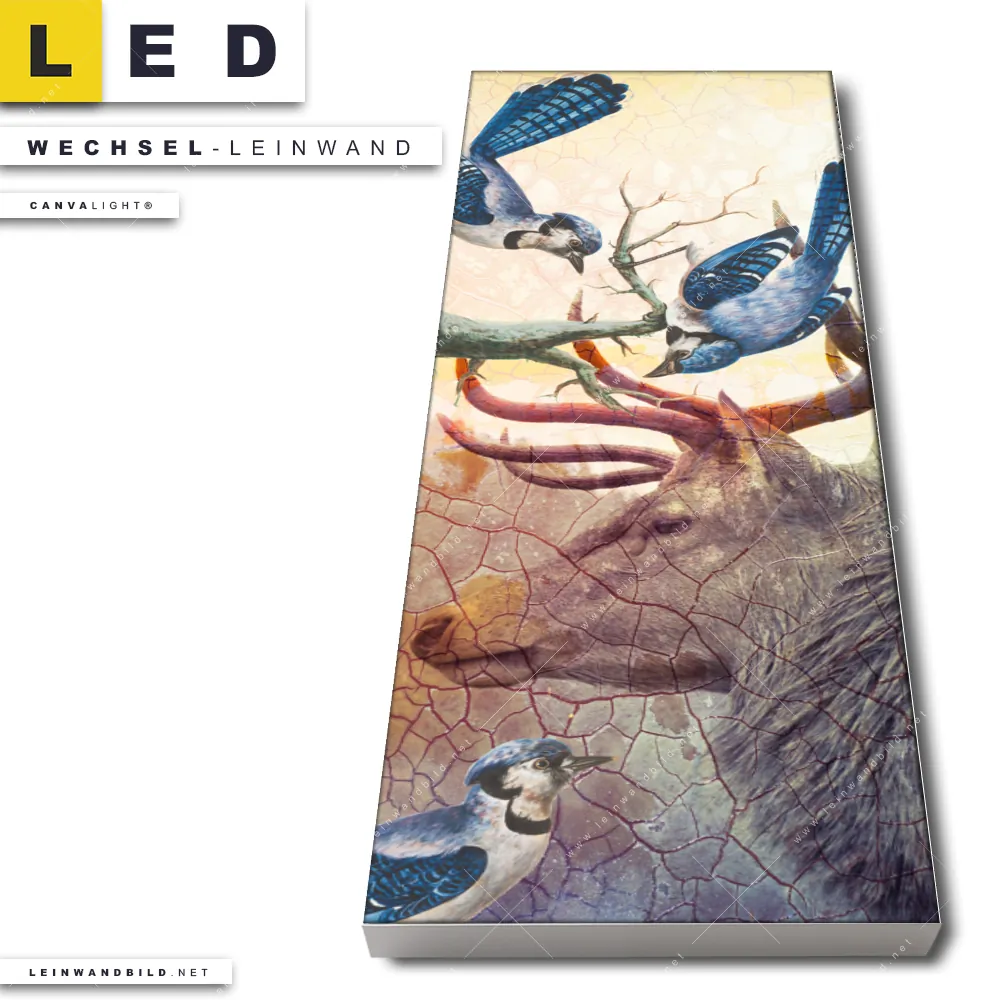 Du konfigurierst Deine individuelle LED Wechsel-Leinwand Canvalight® TEX | Hirsch & Vögel | Schmal und wir produzieren sie NEU für Dich. Unsere Tierwelt Austausch-Fotoleinwände für Canvalight® LED Bilder sind KEINE Lagerware. Du bist Dir unsicher, welches Motiv oder Format das richtige für dein individuelles LED Wechselmotiv auf Leinwand ist, dann helfen wir dir gerne weiter und beraten dich!