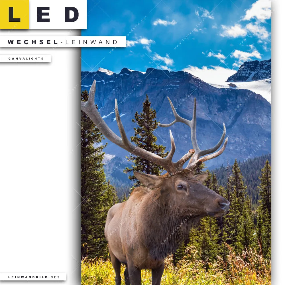 LED Wechsel-Leinwand Canvalight® TEX | Hirsch vor Bergkulisse | Hochformat