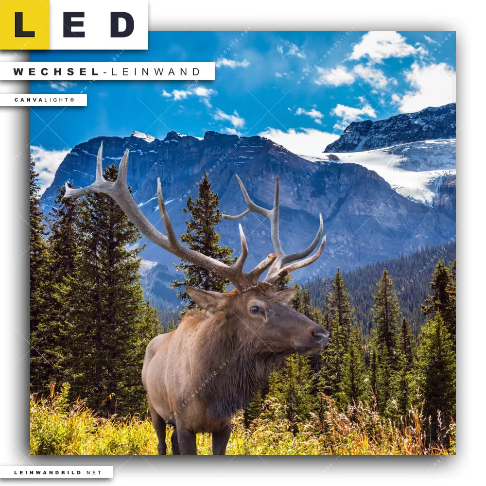 Du bist auf der Suche nach einer Landschaften, Tierwelt, Wald - Bäume Wechsel-Leinwand für Dein LED-Leinwandbild im Quadratischen Format? Begriffe wie Wald, Landschaft, Bäume, Natur, Hirsch, Deer, Wild, Rotwild, Berge, Bergkette, Bergkulisse, Nadelwald haben Dich auf der Suche nach Deiner Ersatz-Leinwand für dein LED Wandbild mit wechselbarer Leinwand inspiriert? Farben wie Braun, Grün, Blau dürfen auf Deinem neuen Wechselmotiv für Dein XXL Leinwand-LED-Bild nicht fehlen und Leinwände im Natürlich - Realistisch Stil für Leuchtbilder passen perfekt zu Deinem Einrichtungsstil?