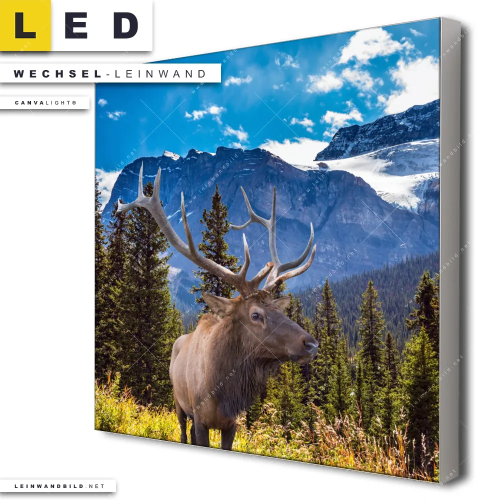 Du konfigurierst Deine individuelle LED Wechsel-Leinwand Canvalight® TEX | Hirsch vor Bergkulisse | Quadrat und wir produzieren sie NEU für Dich. Unsere Landschaften, Tierwelt, Wald - Bäume Austausch-Fotoleinwände für Canvalight® LED Bilder sind KEINE Lagerware. Du bist Dir unsicher, welches Motiv oder Format das richtige für dein individuelles LED Wechselmotiv auf Leinwand ist, dann helfen wir dir gerne weiter und beraten dich!