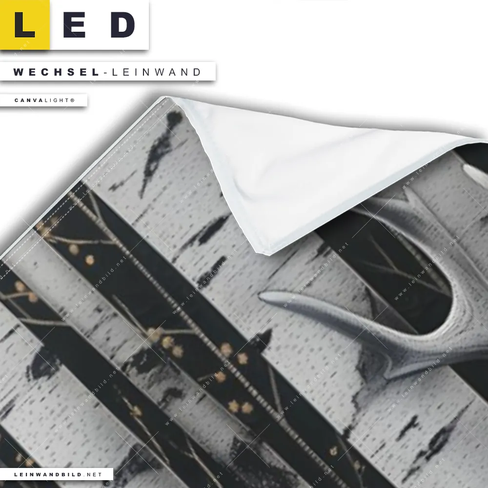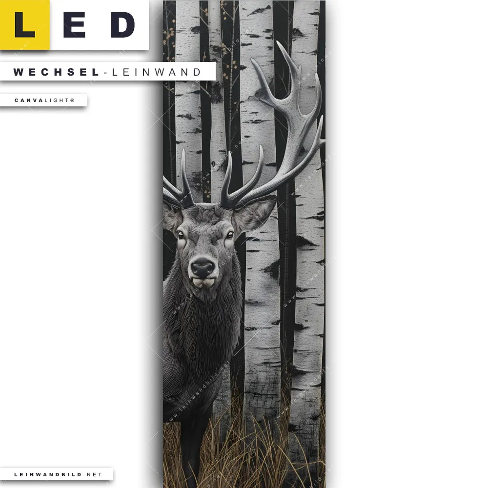 Du bist auf der Suche nach einer Tierwelt, Landschaften, Wald - Bäume Wechsel-Leinwand für Dein LED-Leinwandbild im Schmalen Format? Begriffe wie Birkenwald, Hirsch, Geweih, Rotwild, Wald, Rothirsch, Birken haben Dich auf der Suche nach Deiner Ersatz-Leinwand für dein LED Wandbild im Panorama-Hochformat mit wechselbarer Leinwand inspiriert? Farben wie Braun, Weiss, Schwarz dürfen auf Deinem neuen Wechselmotiv für Dein XXL Leinwand-LED-Bild nicht fehlen und Leinwände im Schwarz - Weiss, Retro - Vintage Stil für Leuchtbilder passen perfekt zu Deinem Einrichtungsstil?