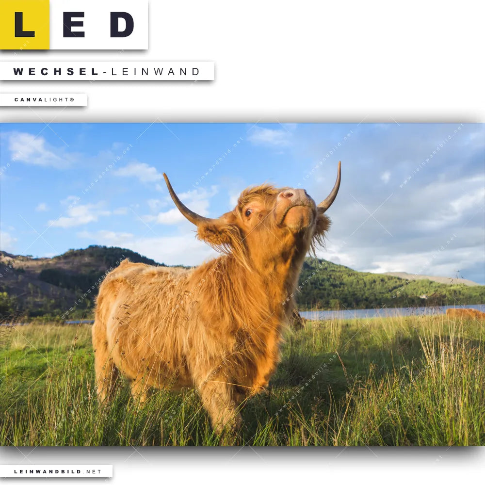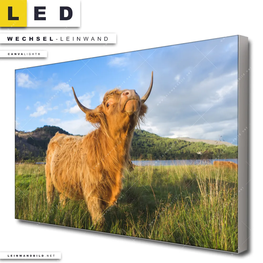 Auf der Suche nach Deinem neuen Wechselmotiv für LED Bilder mit austauschbarer Textil-Leinwand haben Dich Begriffe wie Tier, Stier, Hochlandkuh, Highlander, Büffel, Rind, Bulle, Hochland, Hochlandrind inspiriert? Dann sollte die Wechsel-Leinwand Hochlandrind am Bergsee für Canvalight® TEX LED Leuchtbilder den Weg zu Dir finden.
