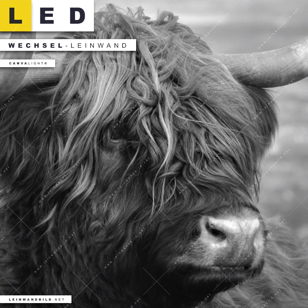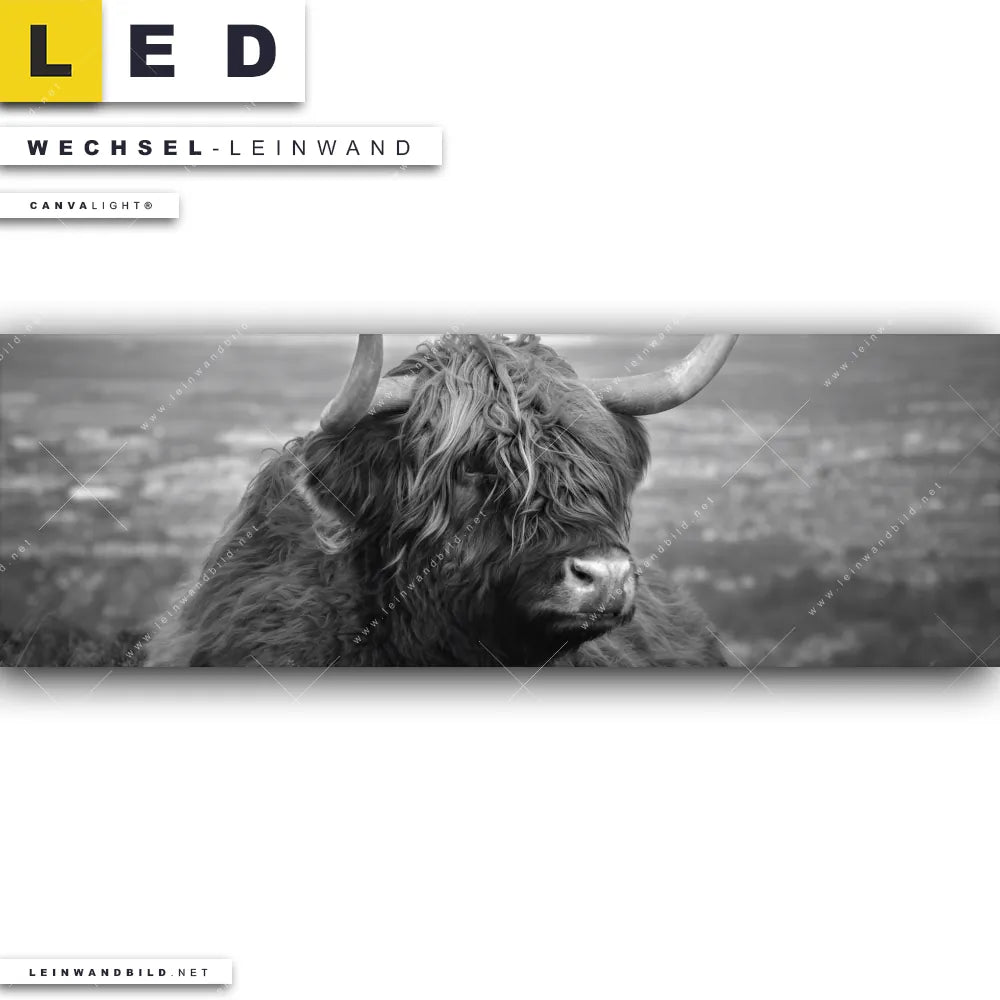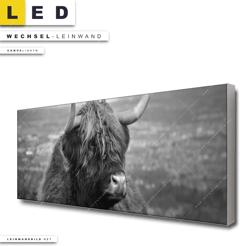 Du bist auf der Suche nach einer Tierwelt Wechsel-Leinwand für Dein LED-Leinwandbild im Panorama-Format? Begriffe wie Tier, Stier, Hochlandkuh, Highlander, Büffel, Rind, Bulle, Hochlandrind, Kuh haben Dich auf der Suche nach Deiner Ersatz-Leinwand für dein extra breites LED Wandbild mit wechselbarer Leinwand inspiriert? Farben wie Schwarz, Weiss dürfen auf Deinem neuen Wechselmotiv für Dein XXL Leinwand-LED-Bild nicht fehlen und Leinwände im Modern Art, Natürlich - Realistisch Stil für Leuchtbilder passen perfekt zu Deinem Einrichtungsstil?