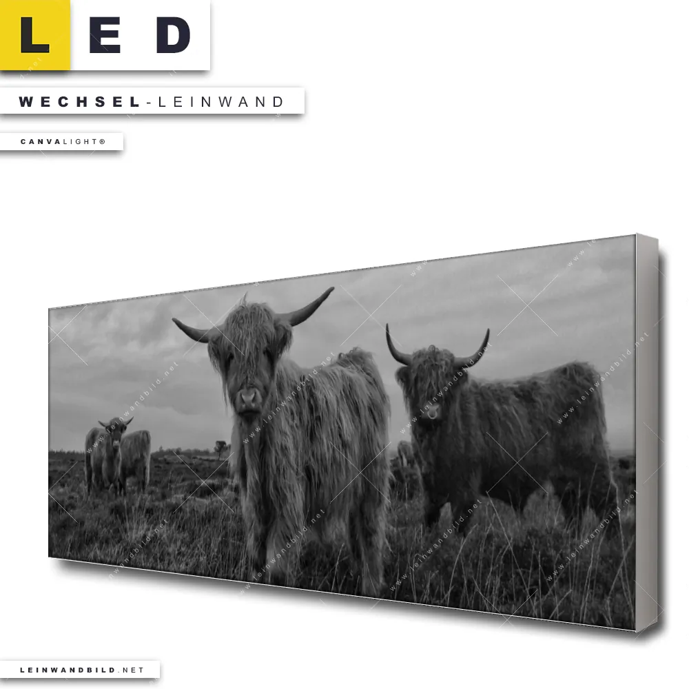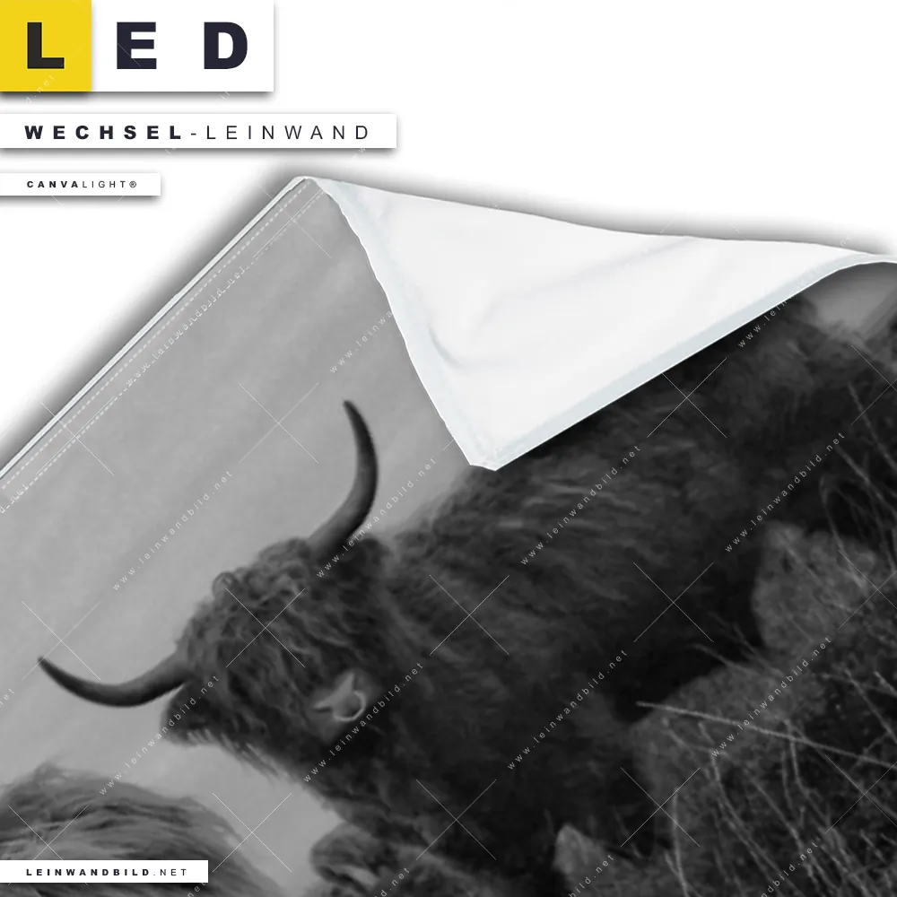 LED Wechsel-Leinwand Canvalight® TEX | Hochland-Rind Schwarz-Weiß | Panorama