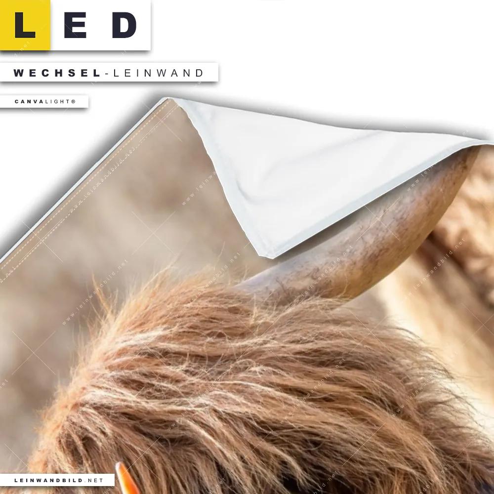 Auf der Suche nach Deinem neuen Wechselmotiv für LED Bilder mit austauschbarer Textil-Leinwand haben Dich Begriffe wie Rind, Hochlandkuh, Hörner, Bulle, Stier inspiriert? Dann sollte die Wechsel-Leinwand Schottisches Rind für Canvalight® TEX LED Leuchtbilder den Weg zu Dir finden.