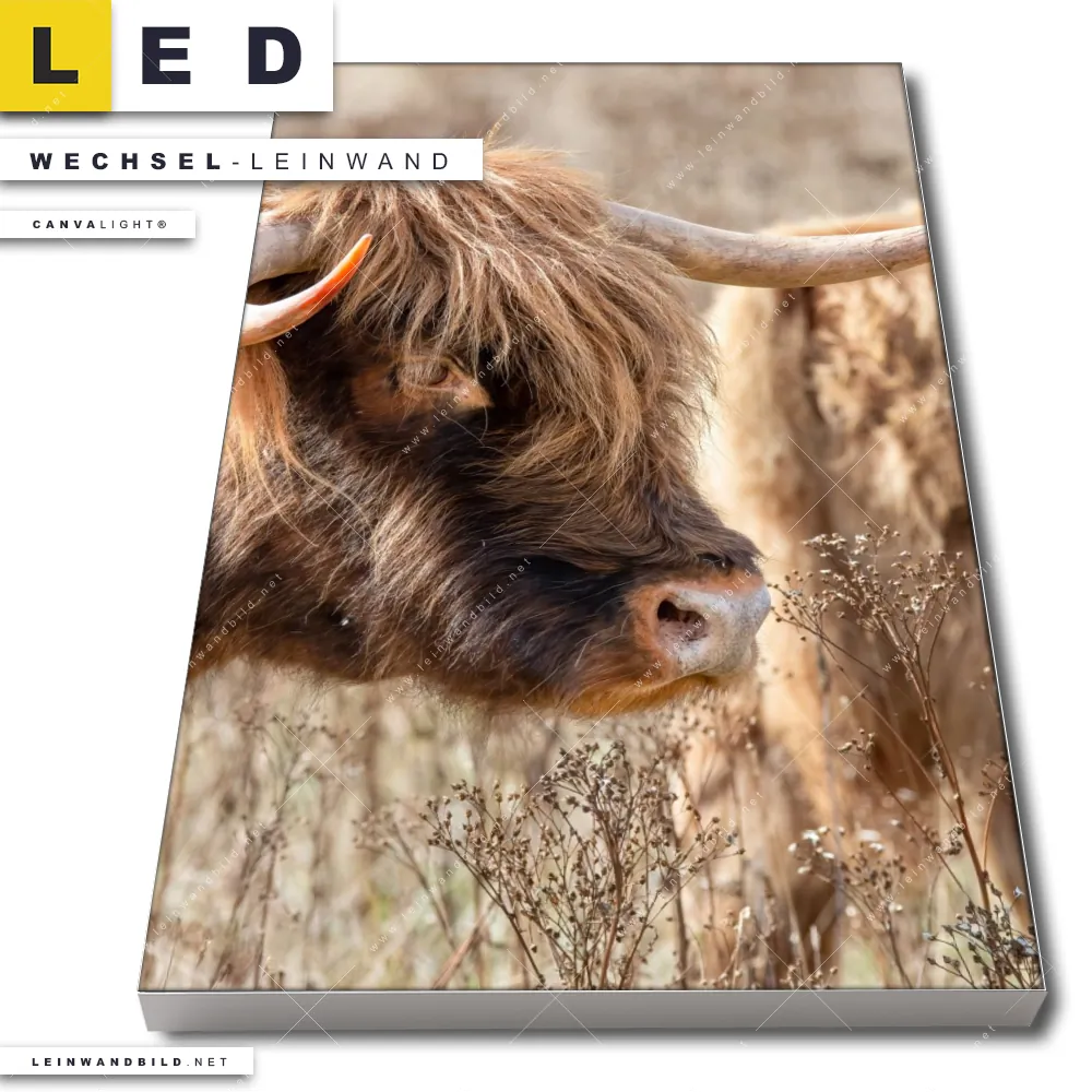 Du bist auf der Suche nach einer Tierwelt Wechsel-Leinwand für Dein LED-Leinwandbild im Hochformat? Begriffe wie Rind, Hochlandkuh, Hörner, Bulle, Stier haben Dich auf der Suche nach Deiner Ersatz-Leinwand für dein LED Wandbild mit wechselbarer Leinwand inspiriert? Farben wie Braun, Beige dürfen auf Deinem neuen Wechselmotiv für Dein XXL Leinwand-LED-Bild nicht fehlen und Leinwände im Natürlich - Realistisch Stil für Leuchtbilder passen perfekt zu Deinem Einrichtungsstil?