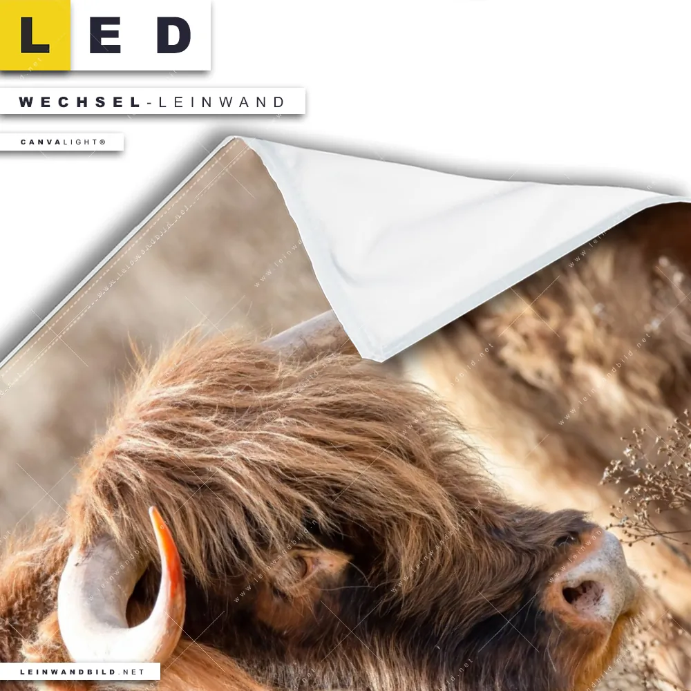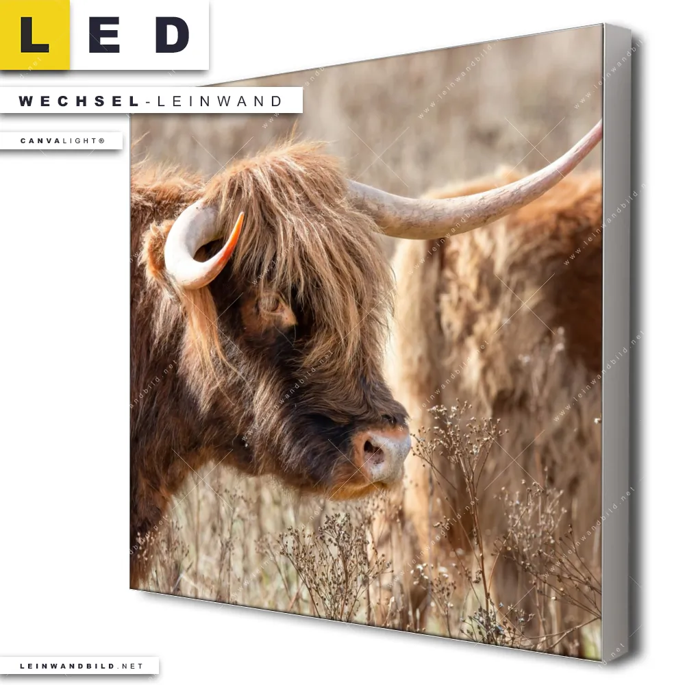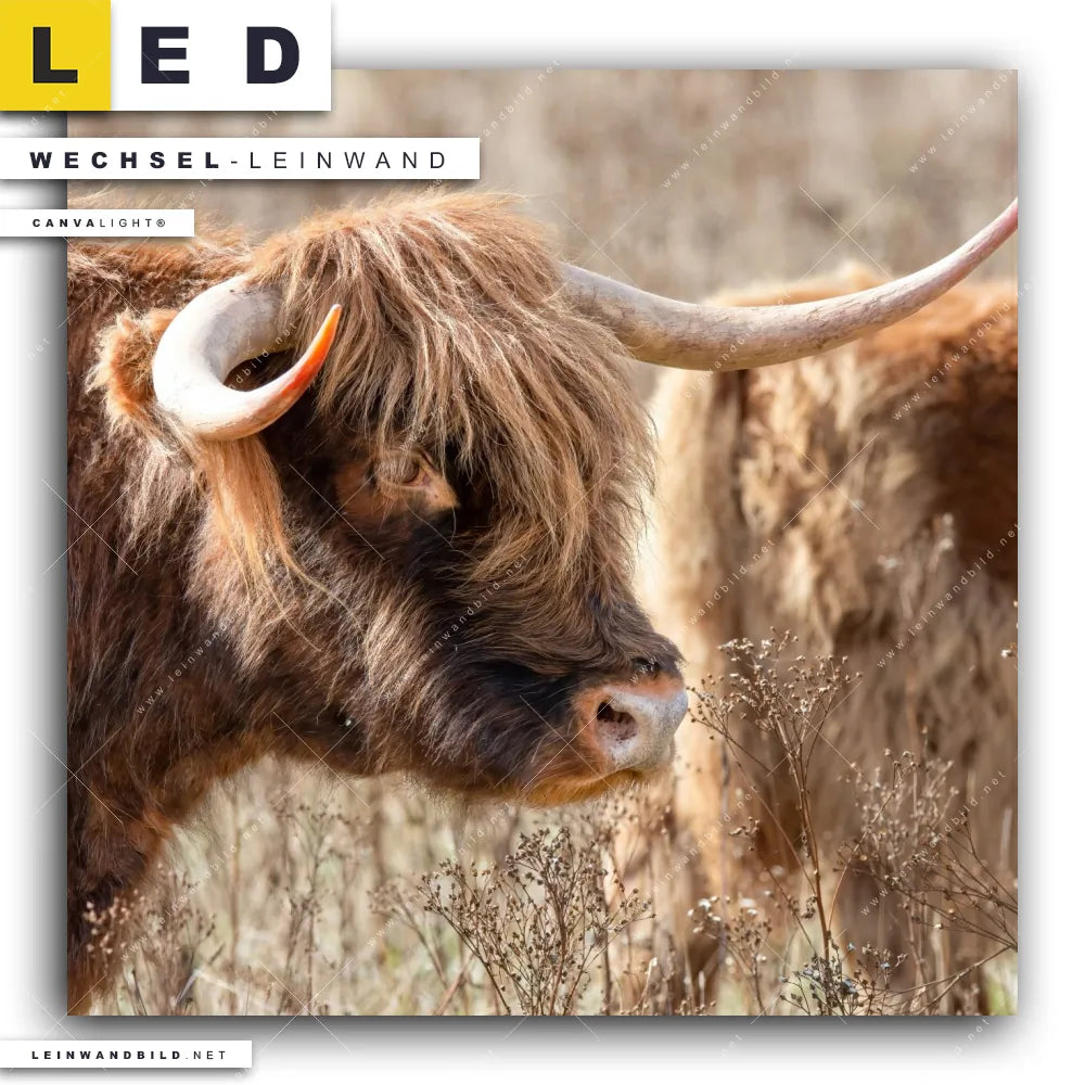 Du bist auf der Suche nach einer Tierwelt Wechsel-Leinwand für Dein LED-Leinwandbild im Quadratischen Format? Begriffe wie Rind, Hochlandkuh, Hörner, Bulle, Stier haben Dich auf der Suche nach Deiner Ersatz-Leinwand für dein LED Wandbild mit wechselbarer Leinwand inspiriert? Farben wie Braun, Beige dürfen auf Deinem neuen Wechselmotiv für Dein XXL Leinwand-LED-Bild nicht fehlen und Leinwände im Natürlich - Realistisch Stil für Leuchtbilder passen perfekt zu Deinem Einrichtungsstil?