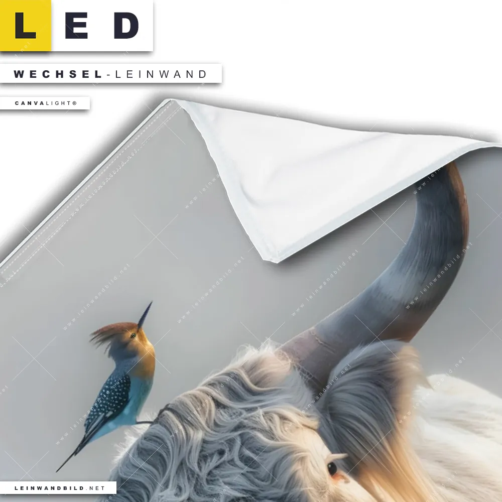 LED Wechsel-Leinwand Canvalight® TEX | Hochlandrind & bunter Vogel | Hochformat