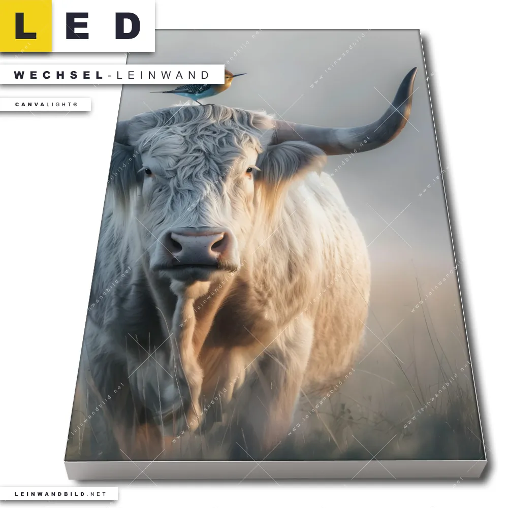 Dann sollte die Wechsel-Leinwand Canvalight® TEX | Hochlandrind & bunter Vogel | Hochformat den Weg zu Dir finden. Die Austausch-Leinwand Nebelmorgen Begegnung - passend für unsere stufenlos dimmbaren, steckerfertigen Leinwandbilder im Leuchtrahmen mit Fernbedienung und optionaler Farbtemperatursteuerung - fügt sich als Eye-Catcher harmonisch in jedes Bar - Gastronomie, Wohnzimmer - Schlafzimmer, Büro - Kanzlei Raumkonzept ein.