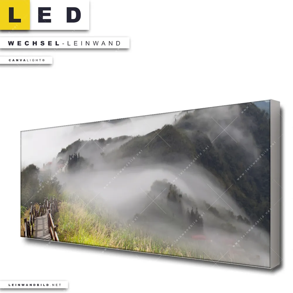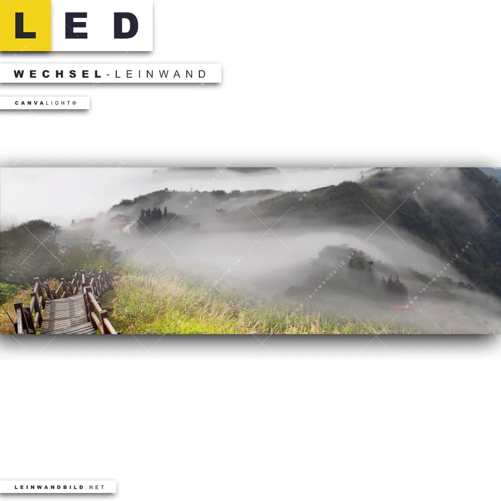 Du bist auf der Suche nach einer Landschaften Wechsel-Leinwand für Dein LED-Leinwandbild im Panorama-Format? Begriffe wie Wanderlust, Berg, Holztreppe, Nebel, Wolken, Sonne, Sonnenaufgang, Wandern, Natur, Landschaft haben Dich auf der Suche nach Deiner Ersatz-Leinwand für dein extra breites LED Wandbild mit wechselbarer Leinwand inspiriert? Farben wie Blau, Braun, Weiss, Grün dürfen auf Deinem neuen Wechselmotiv für Dein XXL Leinwand-LED-Bild nicht fehlen und Leinwände im Natürlich - Realistisch Stil für Leuchtbilder passen perfekt zu Deinem Einrichtungsstil?