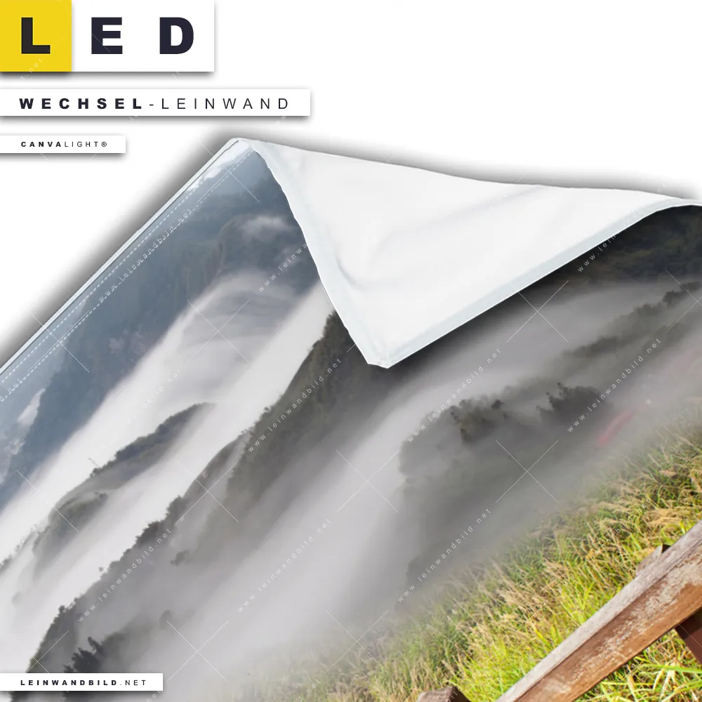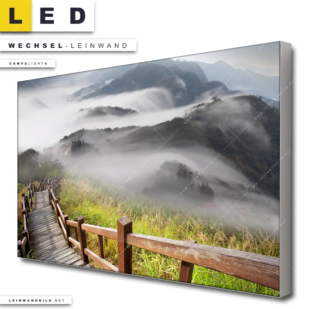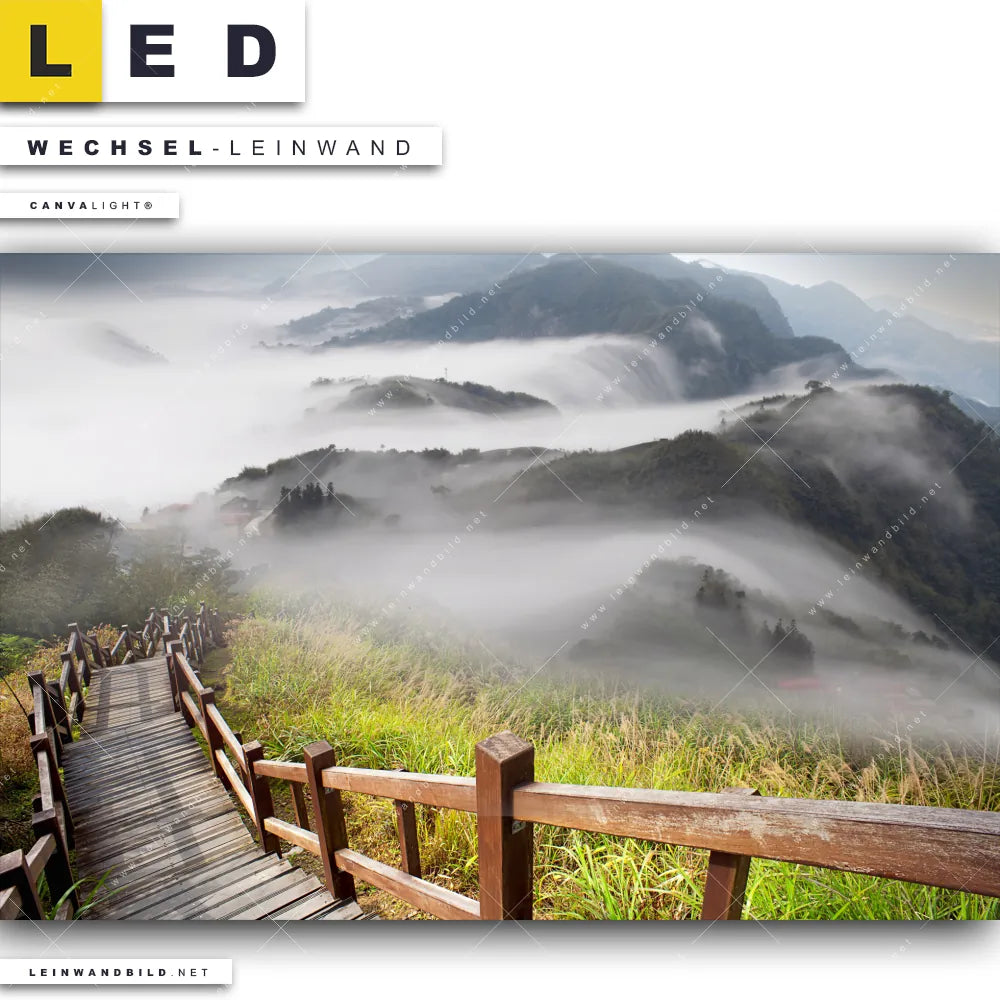 Du bist auf der Suche nach einer Landschaften Wechsel-Leinwand für Dein LED-Leinwandbild im Querformat? Begriffe wie Wanderlust, Berg, Holztreppe, Nebel, Wolken, Sonne, Sonnenaufgang, Wandern, Natur, Landschaft haben Dich auf der Suche nach Deiner Ersatz-Leinwand für dein breites LED Wandbild mit wechselbarer Leinwand inspiriert? Farben wie Blau, Braun, Weiss, Grün dürfen auf Deinem neuen Wechselmotiv für Dein XXL Leinwand-LED-Bild nicht fehlen und Leinwände im Natürlich - Realistisch Stil für Leuchtbilder passen perfekt zu Deinem Einrichtungsstil?
