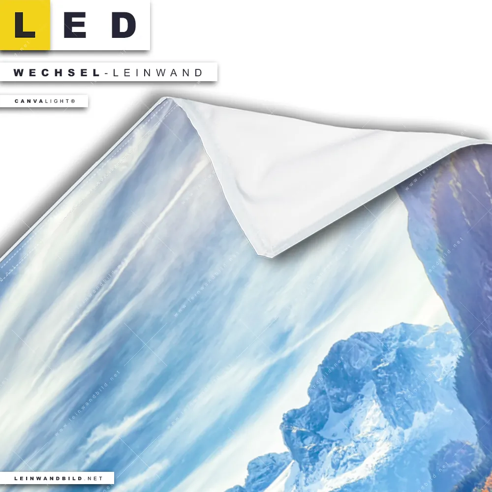 LED Wechsel-Leinwand Canvalight® TEX | Idyllischer Bergsee im Gebirge | Hochformat