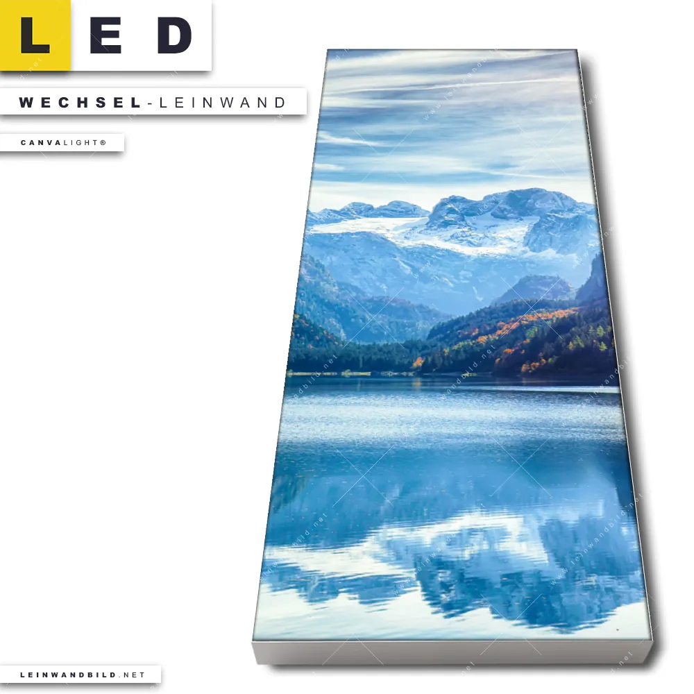 LED Wechsel-Leinwand Canvalight® TEX | Idyllischer Bergsee im Gebirge | Schmal