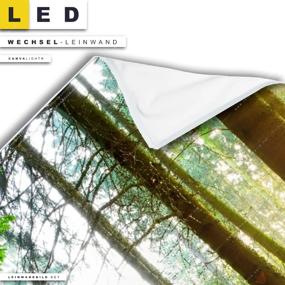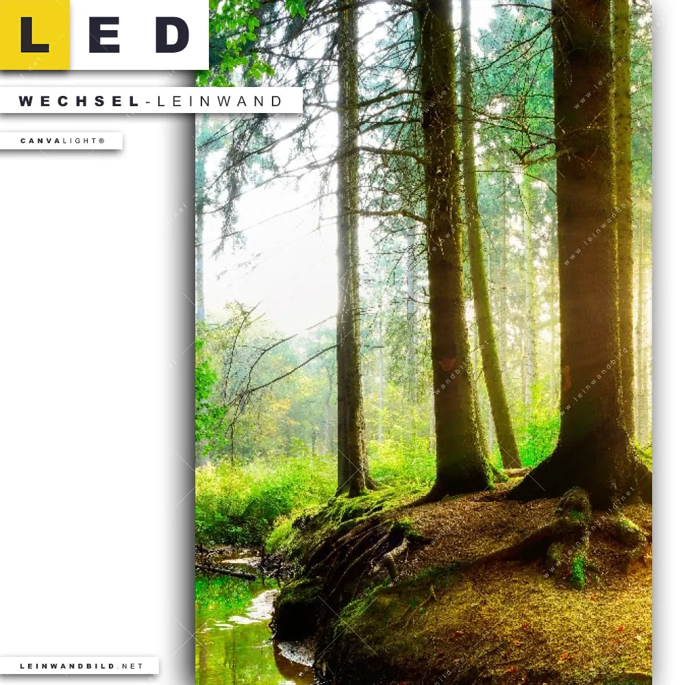 LED Wechsel-Leinwand Canvalight® TEX | Idyllischer Wald bei Sonnenaufgang | Hochformat