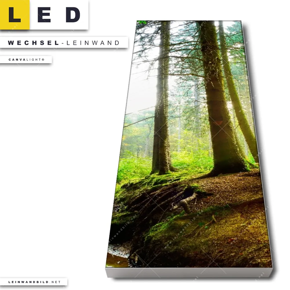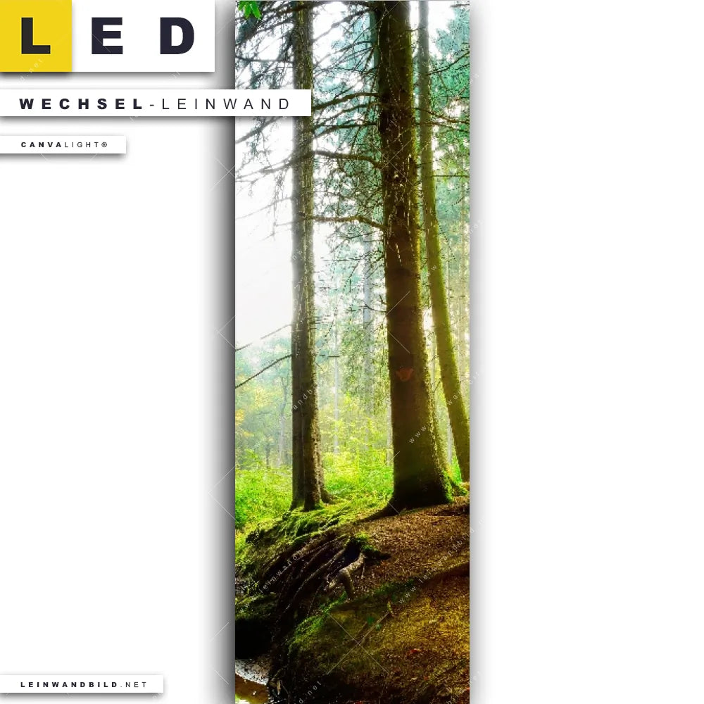 LED Wechsel-Leinwand Canvalight® TEX | Idyllischer Wald bei Sonnenaufgang | Schmal