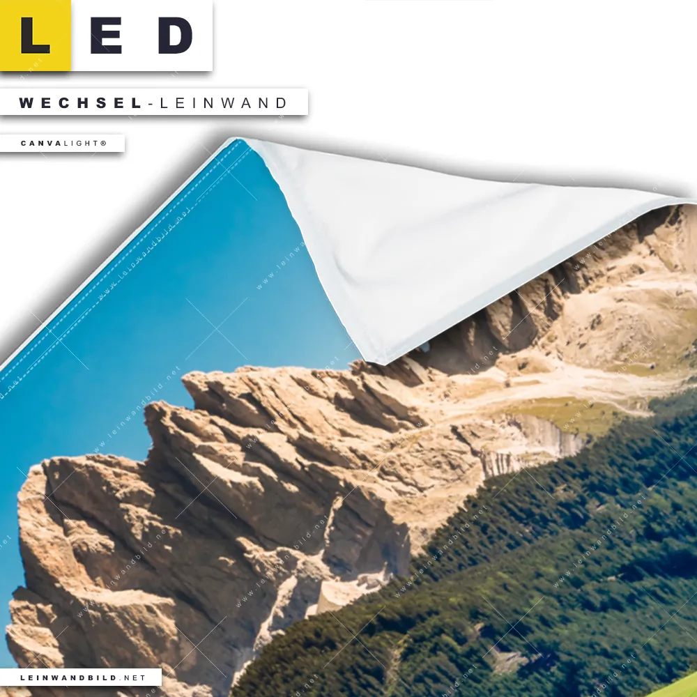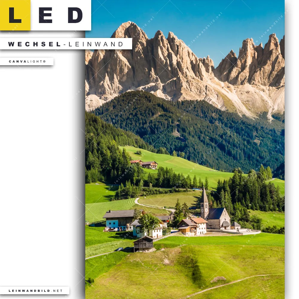 LED Wechsel-Leinwand Canvalight® TEX | Idyllisches Dorf in den Bergen | Hochformat