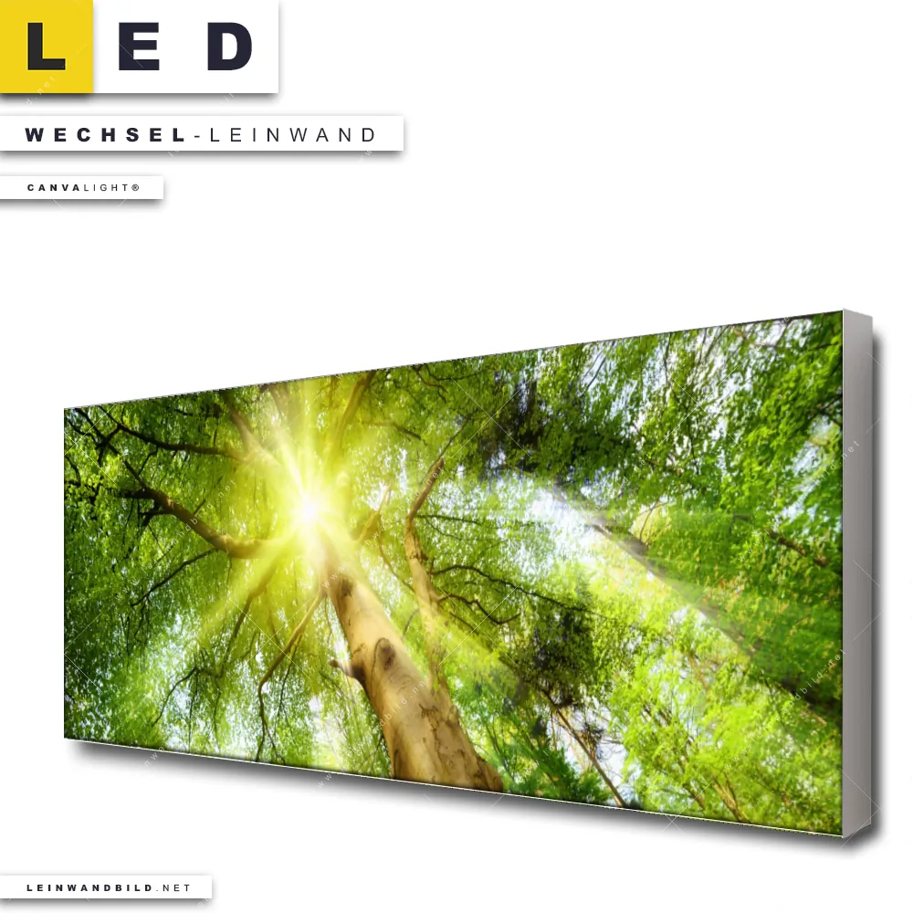 Du bist auf der Suche nach einer Landschaften, Wald - Bäume Wechsel-Leinwand für Dein LED-Leinwandbild im Panorama-Format? Begriffe wie Wald, Baum, Bäume, Natur, Baumkrone, Froschperspektive, Baumkronen, Laubbaum, Lichtung, Sonnenlicht, Sonnenstrahlen, Sonne, Sonnenschein, Buche, Eiche, Baumstamm, Baumwipfel haben Dich auf der Suche nach Deiner Ersatz-Leinwand für dein extra breites LED Wandbild mit wechselbarer Leinwand inspiriert? Farben wie Grün, Hellgrün, Braun dürfen auf Deinem neuen Wechselmotiv für Dein XXL Leinwand-LED-Bild nicht fehlen und Leinwände im Natürlich - Realistisch, Modern Art Stil für Leuchtbilder passen perfekt zu Deinem Einrichtungsstil?