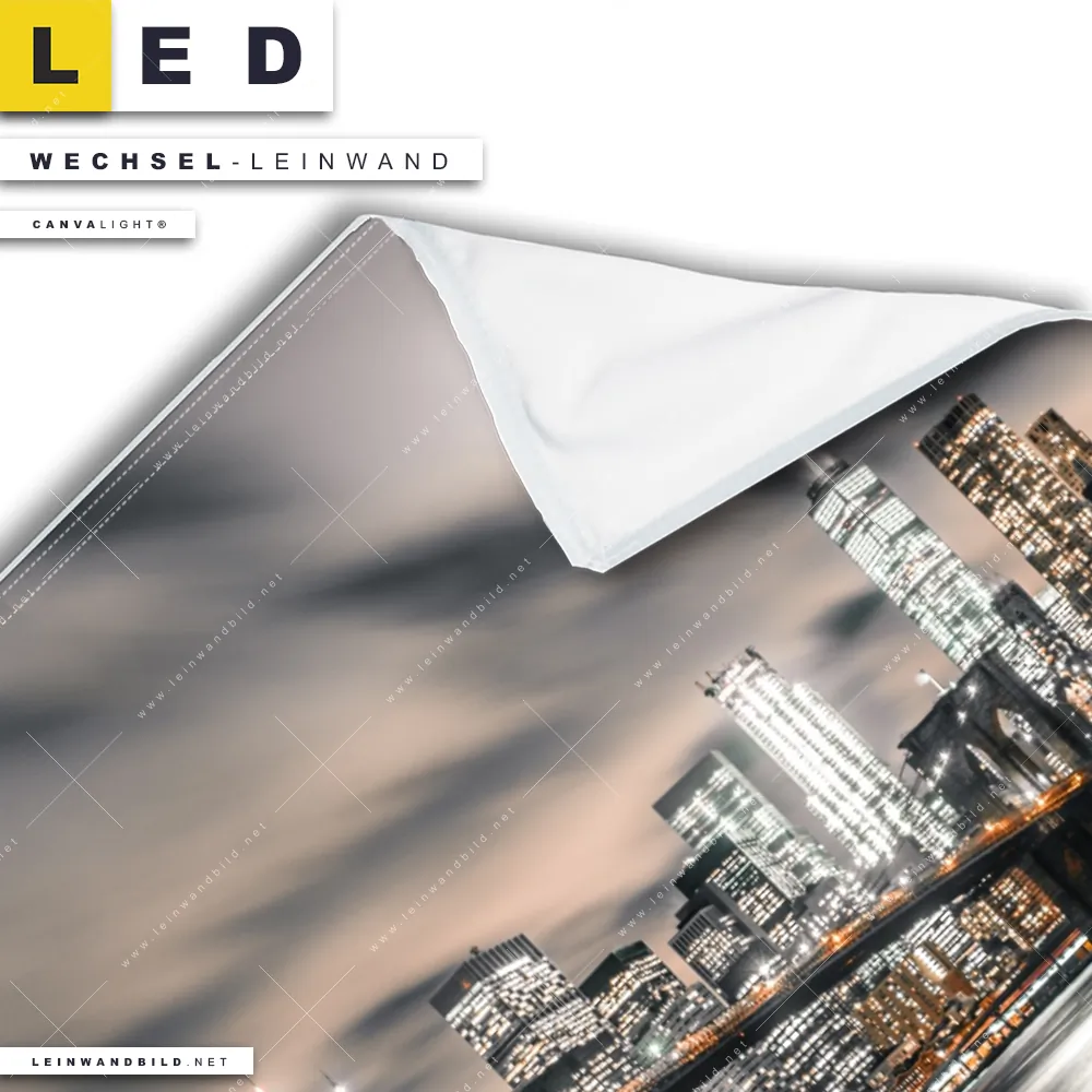 Bitte beachte, dass die Farben, der auf dem Monitor abgebildeten Manhatten in der Nacht Darstellung, möglicherweise von den Originalfarben deiner Canvalight® TEX Wechsel-Leinwand abweichen können.