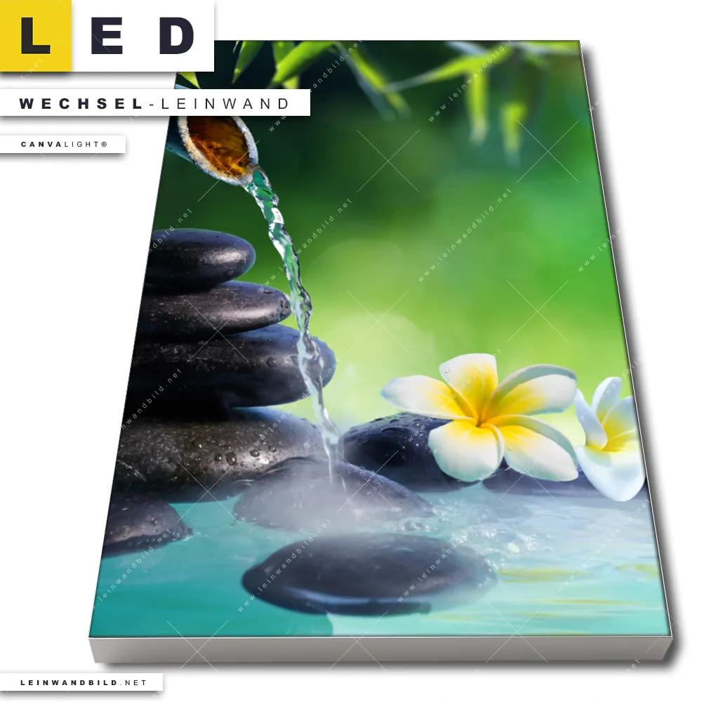 Dann sollte die Wechsel-Leinwand Canvalight® TEX | Japanischer Brunnen | Hochformat den Weg zu Dir finden. Die Austausch-Leinwand Blüten, Bambus und Zensteine - passend für unsere stufenlos dimmbaren, steckerfertigen Leinwandbilder im Leuchtrahmen mit Fernbedienung und optionaler Farbtemperatursteuerung - fügt sich als Eye-Catcher harmonisch in jedes Arzt - Praxis, Wohnzimmer - Schlafzimmer, Friseur - Beauty Raumkonzept ein.