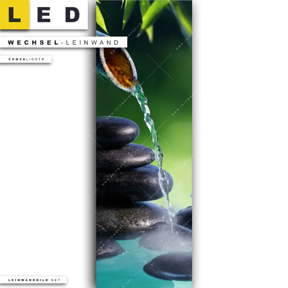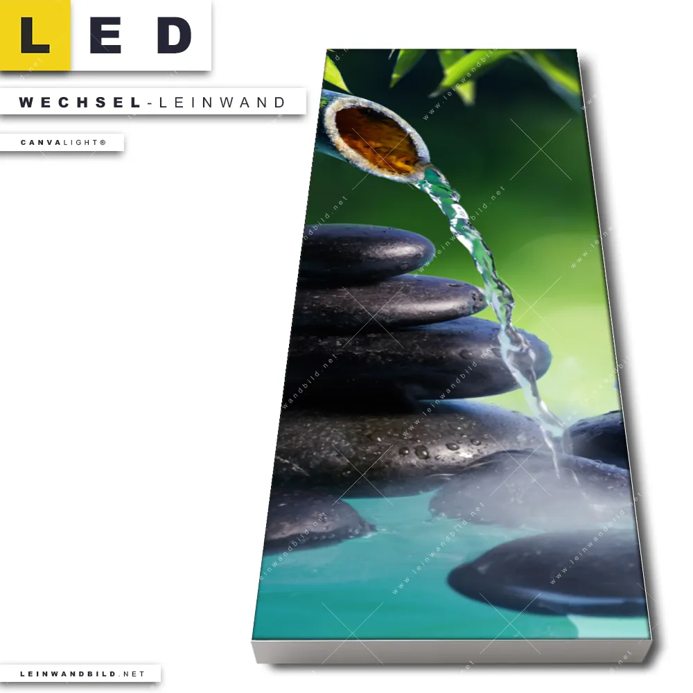 Dann sollte die Wechsel-Leinwand Canvalight® TEX | Japanischer Brunnen | Schmal den Weg zu Dir finden. Die Austausch-Leinwand Zen-Steine im Wasser - passend für unsere stufenlos dimmbaren, steckerfertigen Leinwandbilder im LED Leuchtrahmen mit Fernbedienung und optionaler Farbtemperatursteuerung - fügt sich als Eye-Catcher harmonisch in jedes Arzt - Praxis, Wohnzimmer - Schlafzimmer, Friseur - Beauty Raumkonzept ein.