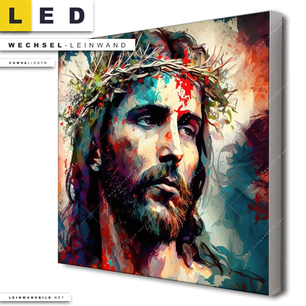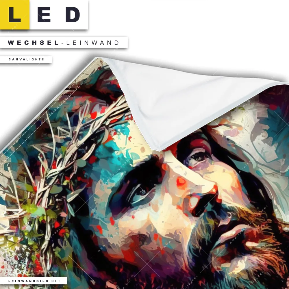 Du konfigurierst Deine individuelle LED Wechsel-Leinwand Canvalight® TEX | Jesus Christus mit Dornenkrone | Quadrat und wir produzieren sie NEU für Dich. Unsere Porträts - Menschen Austausch-Fotoleinwände für Canvalight® LED Bilder sind KEINE Lagerware. Du bist Dir unsicher, welches Motiv oder Format das richtige für dein individuelles LED Wechselmotiv auf Leinwand ist, dann helfen wir dir gerne weiter und beraten dich!