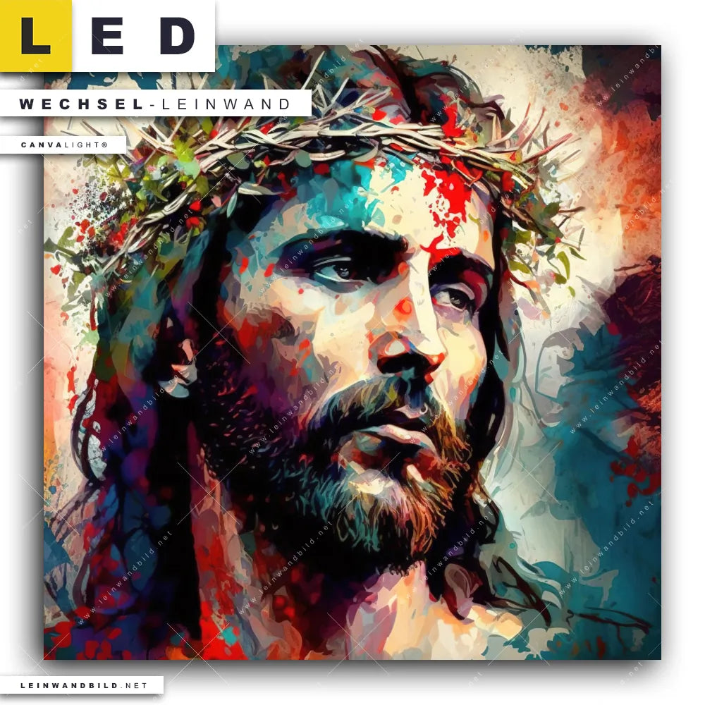 Dann sollte die Wechsel-Leinwand Canvalight® TEX | Jesus Christus mit Dornenkrone | Quadrat den Weg zu Dir finden. Die Austausch-Leinwand Martyrium des Geistigen - passend für unsere stufenlos dimmbaren, steckerfertigen Leinwandbilder im Leuchtrahmen mit Fernbedienung und optionaler Farbtemperatursteuerung - fügt sich als Eye-Catcher harmonisch in jedes Wohnzimmer - Schlafzimmer, Büro - Kanzlei, Flur - Eingangsbereich Raumkonzept ein.