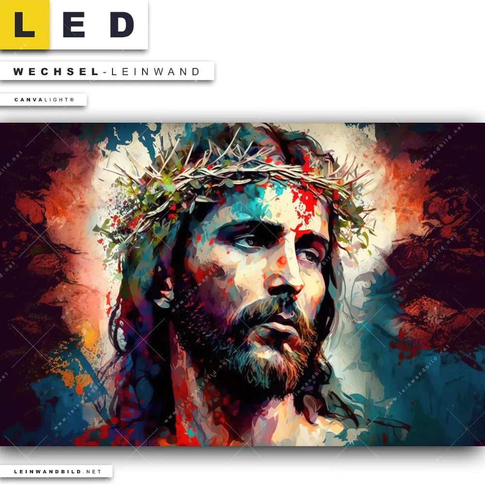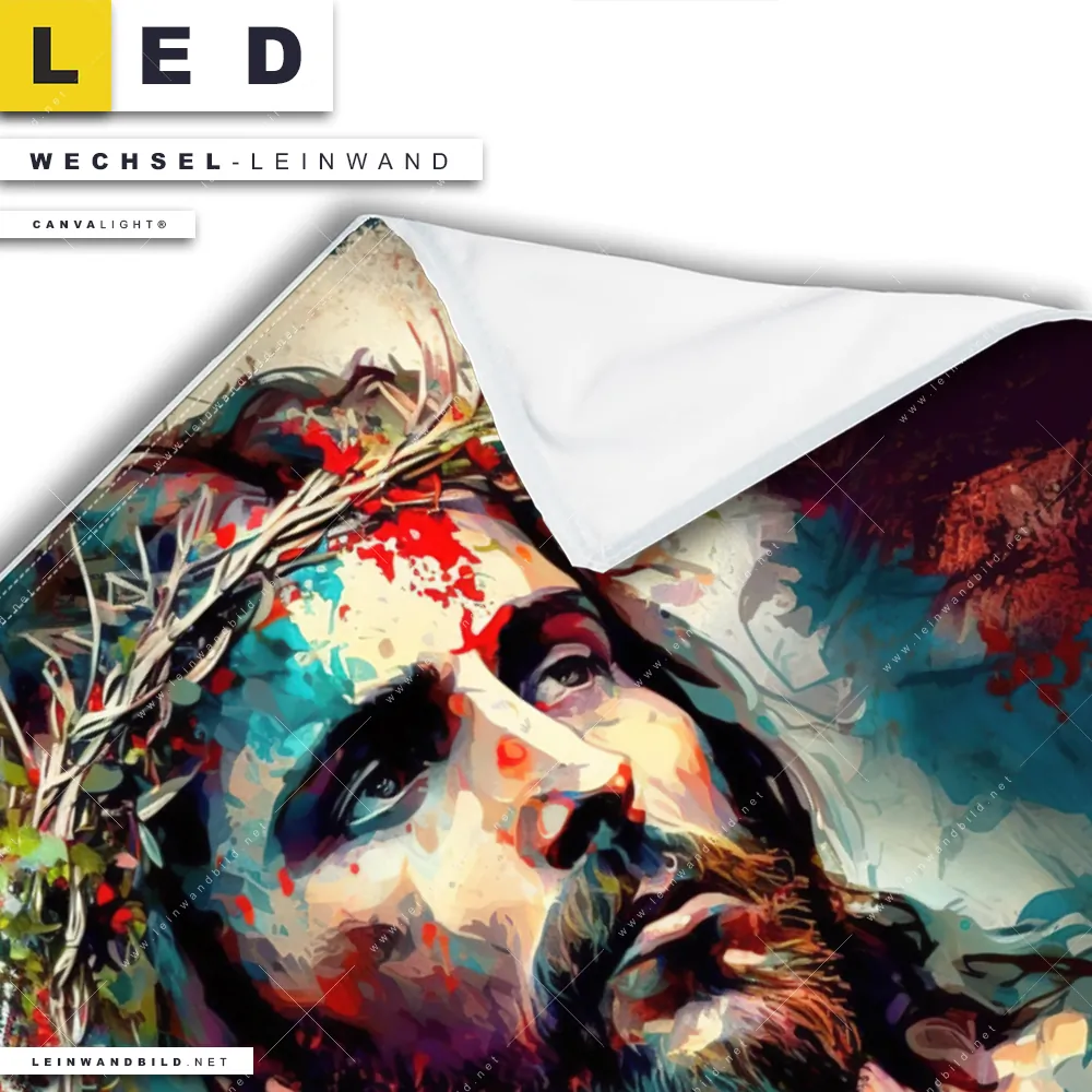 Dann sollte die Wechsel-Leinwand Canvalight® TEX | Jesus Christus mit Dornenkrone | Querformat den Weg zu Dir finden. Die Austausch-Leinwand Martyrium des Geistigen - passend für unsere stufenlos dimmbaren, steckerfertigen Leinwandbilder im Leuchtrahmen mit Fernbedienung und optionaler Farbtemperatursteuerung - fügt sich als Eye-Catcher harmonisch in jedes Wohnzimmer - Schlafzimmer, Büro - Kanzlei, Flur - Eingangsbereich Raumkonzept ein.