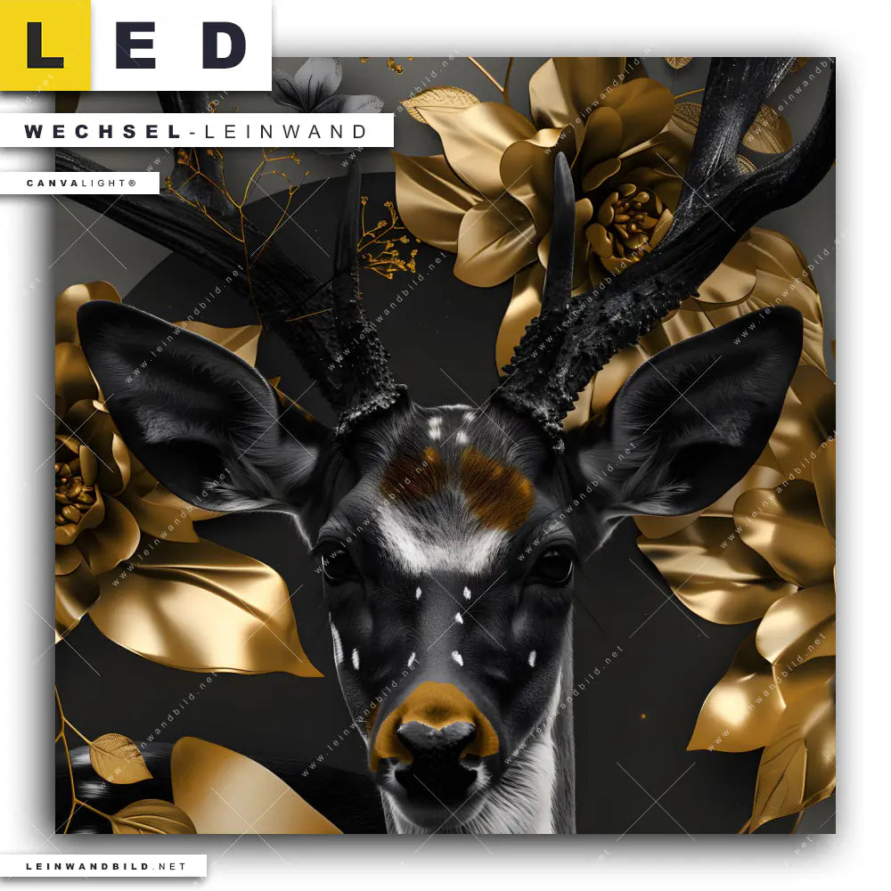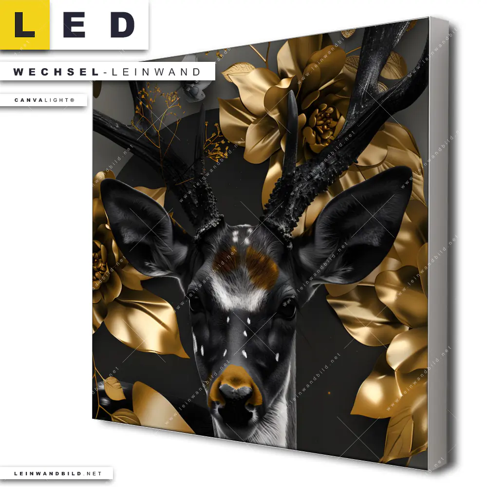 Du bist auf der Suche nach einer Tierwelt, Blumen - Botanik Wechsel-Leinwand für Dein LED-Leinwandbild im Quadratischen Format? Begriffe wie Tierporträt, Hirsch, Blüten, Rotwild, Geweih, Blumen, Rothirsch haben Dich auf der Suche nach Deiner Ersatz-Leinwand für dein LED Wandbild mit wechselbarer Leinwand inspiriert? Farben wie Schwarz, Gold, Grau dürfen auf Deinem neuen Wechselmotiv für Dein XXL Leinwand-LED-Bild nicht fehlen und Leinwände im Floral, Modern Art Stil für Leuchtbilder passen perfekt zu Deinem Einrichtungsstil?