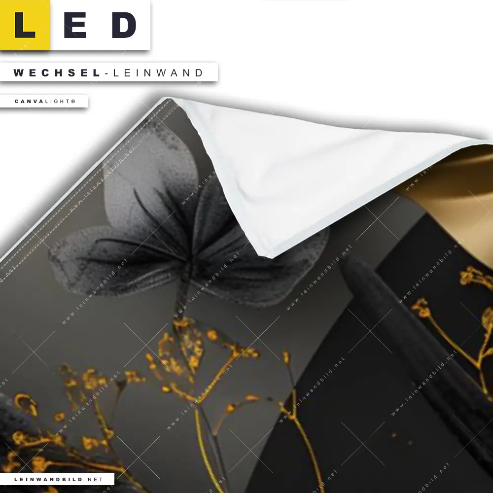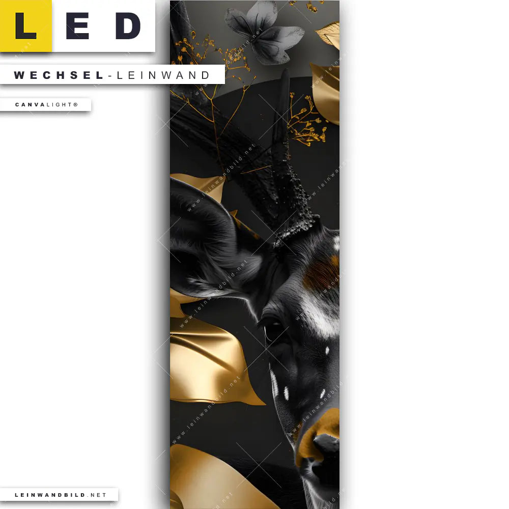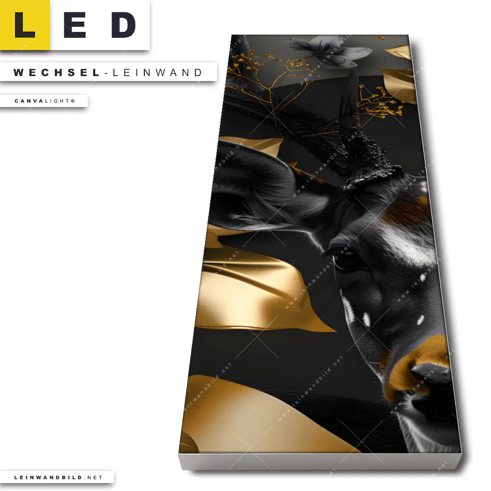 LED Wechsel-Leinwand Canvalight® TEX | Junger Hirsch und Goldblumen | Schmal