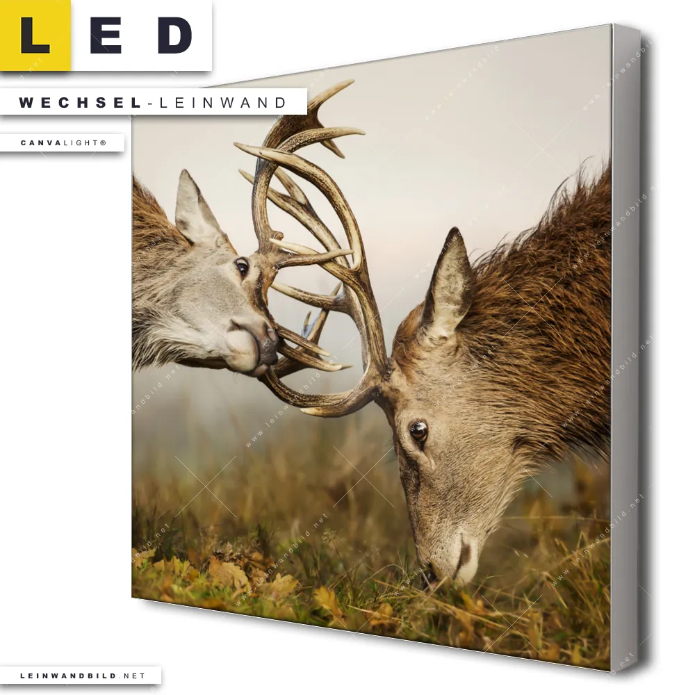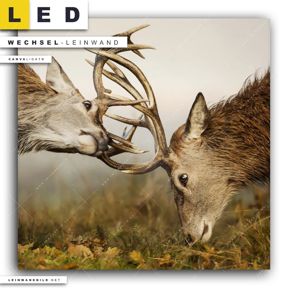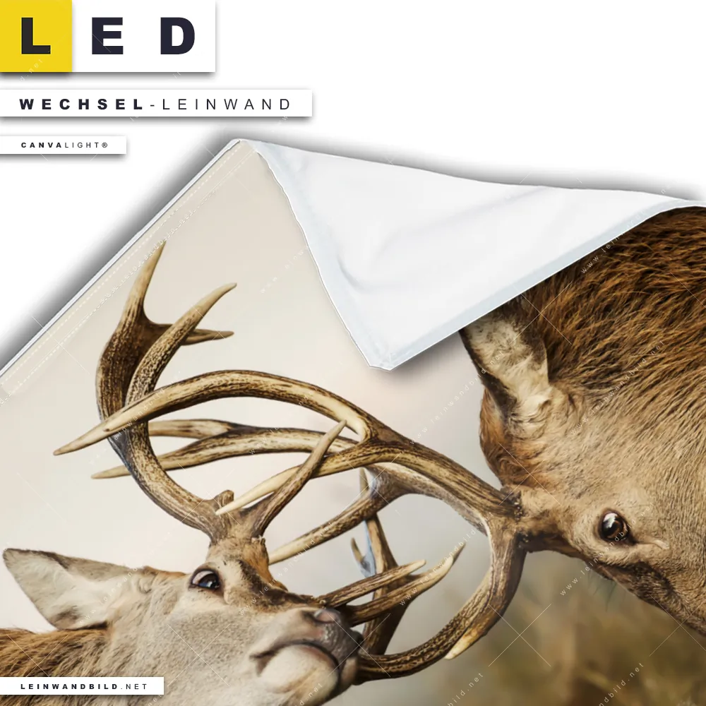 Du bist auf der Suche nach einer Tierwelt Wechsel-Leinwand für Dein LED-Leinwandbild im Quadratischen Format? Begriffe wie Hirsch, Deer, skandinavisch, Rotwild, Reh, Dammwild, Geweih, Kampf haben Dich auf der Suche nach Deiner Ersatz-Leinwand für dein LED Wandbild mit wechselbarer Leinwand inspiriert? Farben wie Braun, Beige dürfen auf Deinem neuen Wechselmotiv für Dein XXL Leinwand-LED-Bild nicht fehlen und Leinwände im Natürlich - Realistisch Stil für Leuchtbilder passen perfekt zu Deinem Einrichtungsstil?