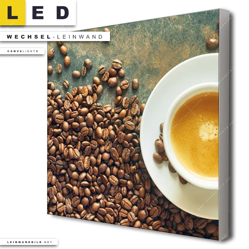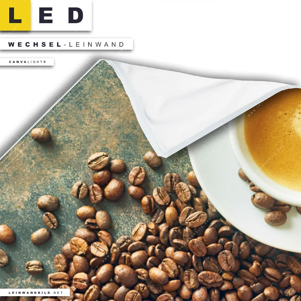 Dann sollte die Wechsel-Leinwand Canvalight® TEX | Kaffee-Genuss | Quadrat den Weg zu Dir finden. Die Austausch-Leinwand Kaffeebohnen mit Kaffeetasse - passend für unsere stufenlos dimmbaren, steckerfertigen Leinwandbilder im Leuchtrahmen mit Fernbedienung und optionaler Farbtemperatursteuerung - fügt sich als Eye-Catcher harmonisch in jedes Bar - Gastronomie, Küche - Esszimmer Raumkonzept ein.